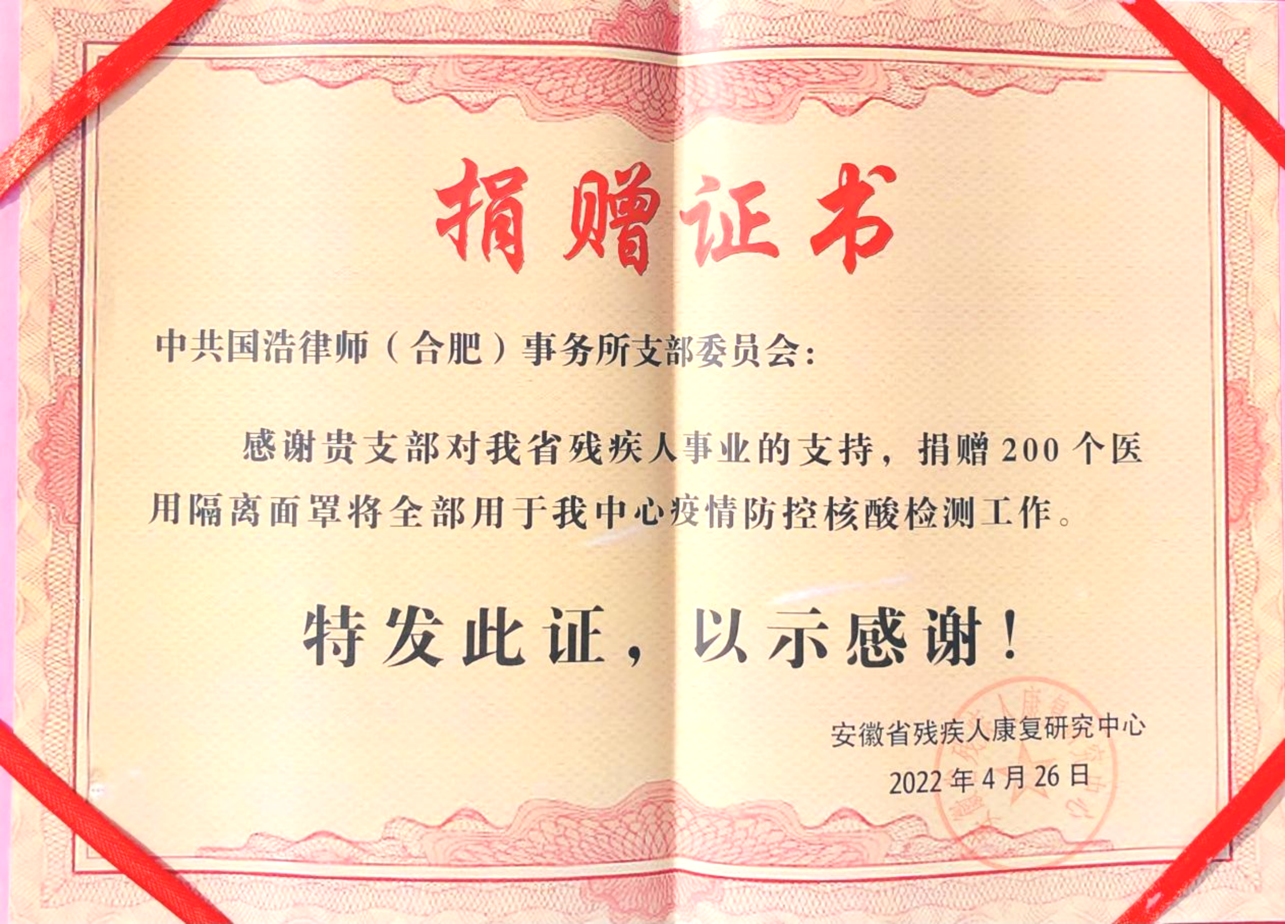為支援疫情防控,國浩合肥團支部協助國浩合肥黨支部,向安徽省殘疾人康復研究中心捐贈了200個醫用隔離面罩。4月26日,國浩合肥黨支部書記、管理合伙人史東洋和國浩合肥團支部書記潘夢瑤參加了捐贈儀式,獲得了康復中心領導的充分肯定和真誠感謝。