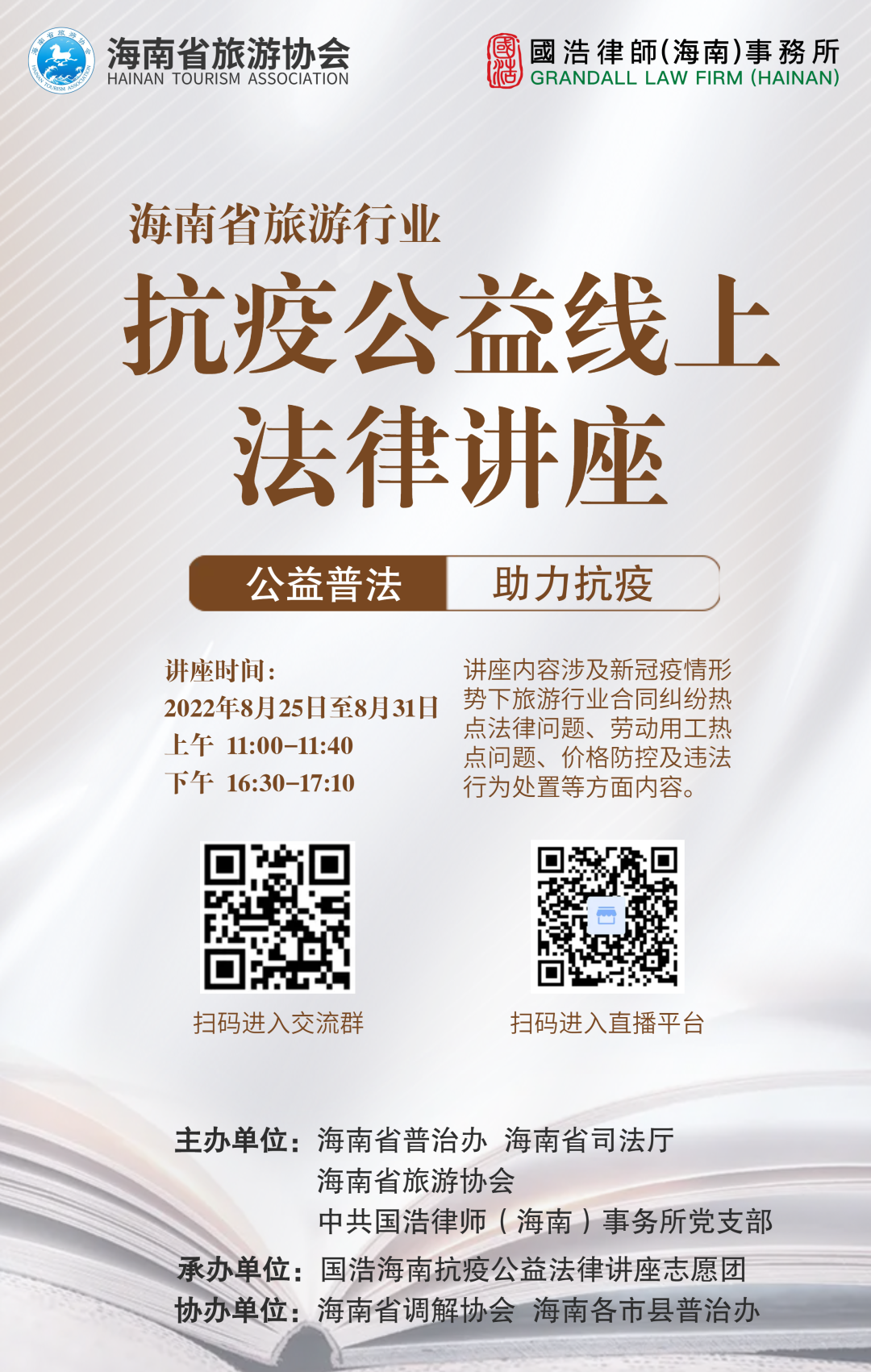海南省旅游行業抗疫公益線上法律講座于8月25日至8月31日,每日上午11:00-11:40與下午16:30-17:10進行線上直播,共計14場。本次公益普法講座主題設置豐富充實,覆蓋面廣,不僅涵蓋旅游行業在新冠肺炎疫情之下可能涉及的旅游合同糾紛、價格防控及違法行為處置、勞動用工、房屋租賃、金融借款糾紛等問題,還包含傳染病防治法律法規、涉疫刑事犯罪罪名、個人信息保護、抗疫物資捐贈等相關法律問題的解讀。