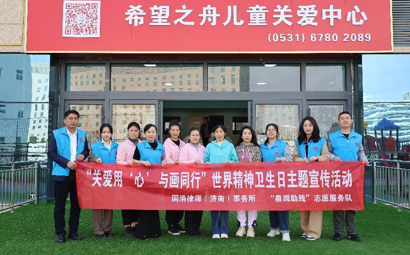 為迎接二十大召開,關心關愛精神殘疾人,2022年10月12日,在山東省濟南市歷下區殘聯指導下,國浩濟南黨總支與濟南希望之舟特殊兒童服務中心(以下簡稱“服務中心”)、“泉潤助殘”志愿服務隊聯合開展世界精神衛生日“關愛用‘心’ 與畫同行”活動,“泉潤助殘”志愿者、國浩濟南律師志愿者共同參與。