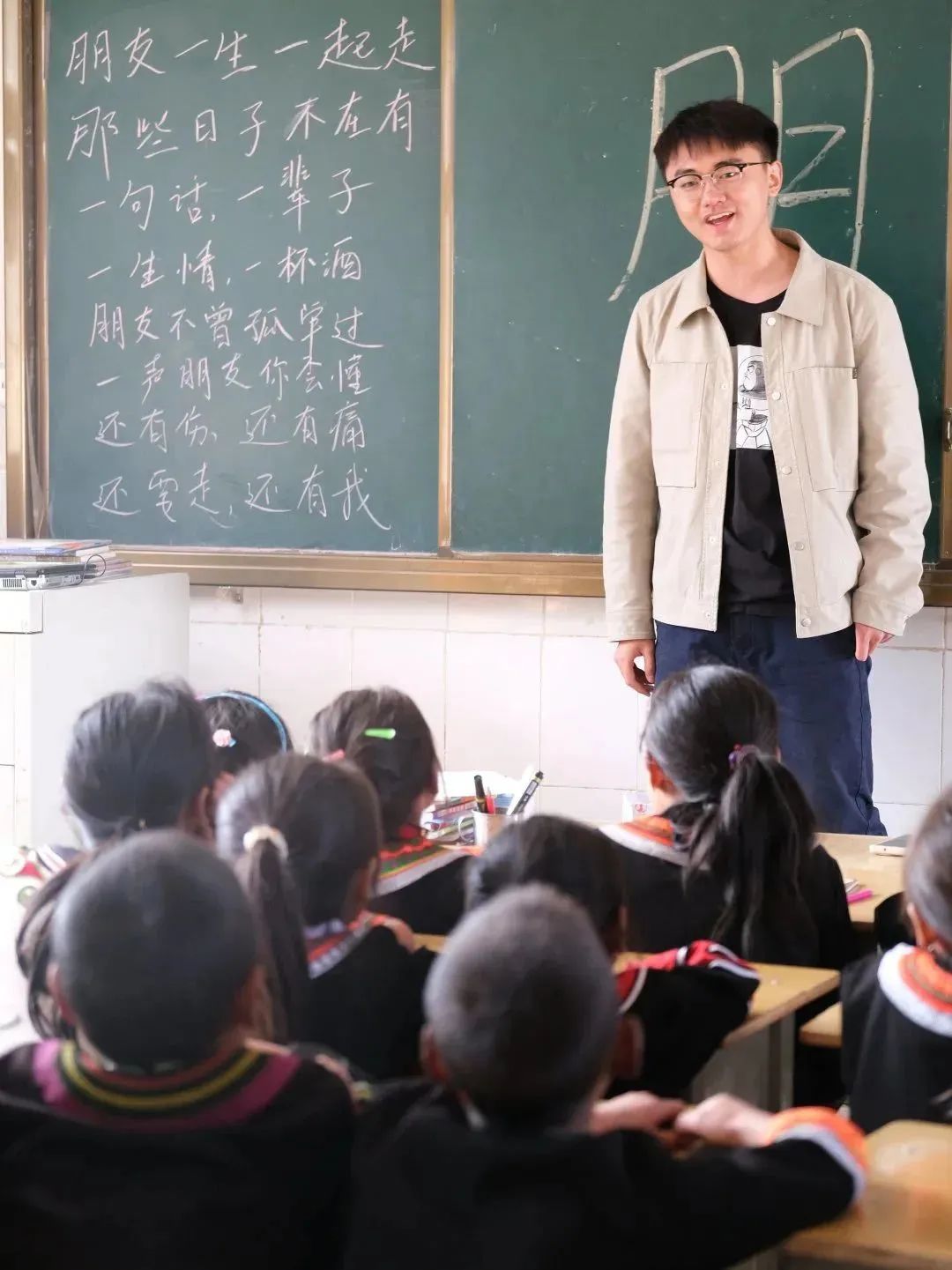 書籍整理完畢,公益委王玉還給小朋友們臨時上了一堂特別的音樂課——教小朋友們唱《朋友》。“朋友一生一起走,那些日子不再有……”在短短四十分鐘的課程里,教小朋友認字、教小朋友唱歌,并且與公益委的其他成員們一起完成了大合唱。