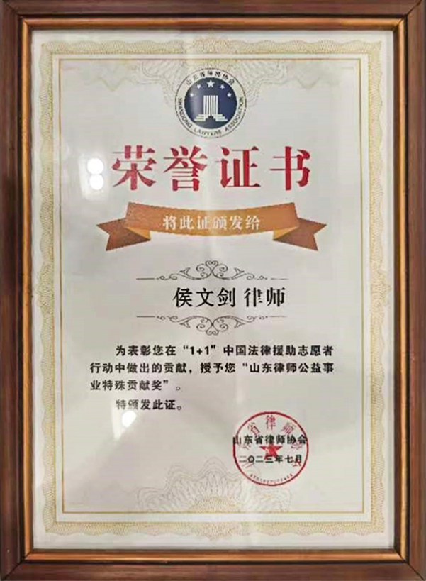 7月18日,山東省律師協會印發《關于對全省參加“1+1”中國法律援助志愿者行動等項目的律師予以表揚的通報》,國浩青島律師侯文劍榮獲“山東律師公益事業特殊貢獻獎”。