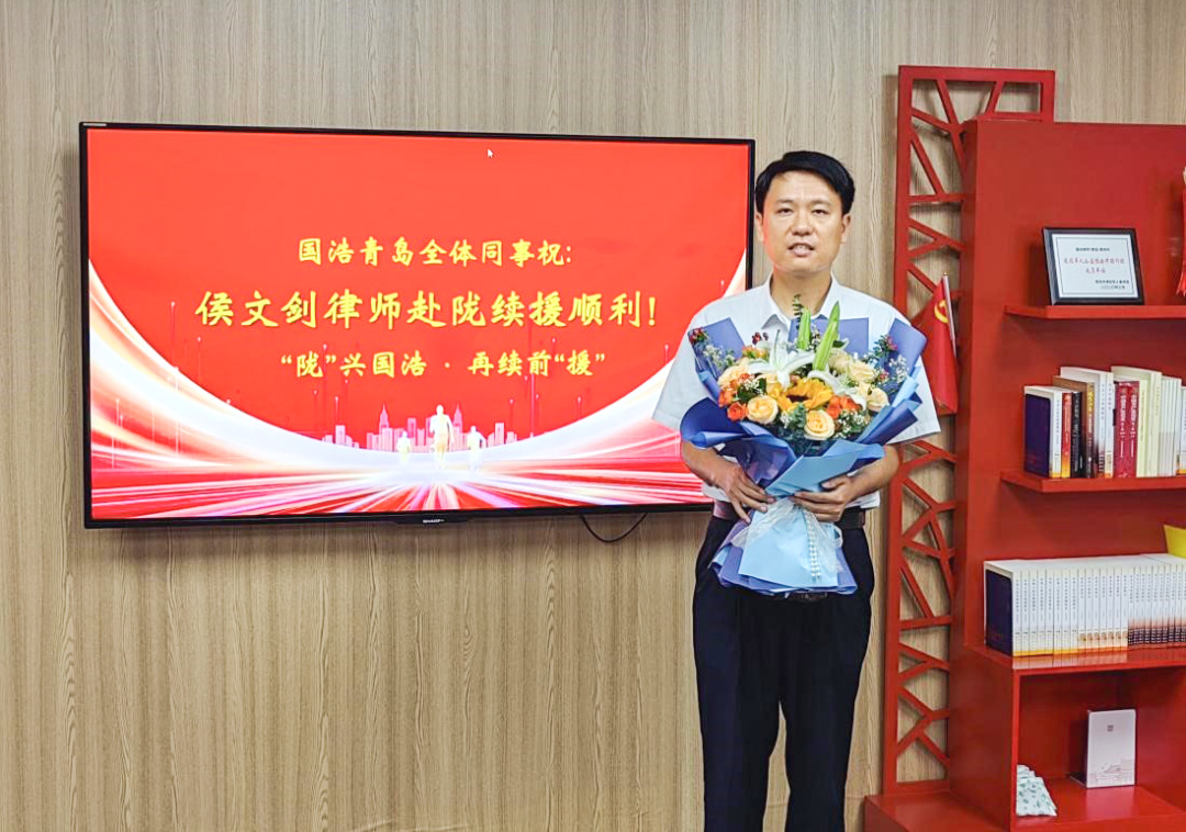 為響應司法部、中國法律援助基金會、中華全國律師協會等聯合開展“1+1”中國法律援助志愿者行動的號召,國浩青島自2020年起選派青年律師侯文劍前往甘肅省開展法律援助工作。2023年7月21日,國浩青島為侯文劍律師舉辦了以“做黨和人民滿意的好律師”為主題的返青座談會,國浩青島管理合伙人周鵬、合伙人彭山嶺及多名青年律師代表參加,國浩青島黨支部書記、合伙人王振寶主持會議。