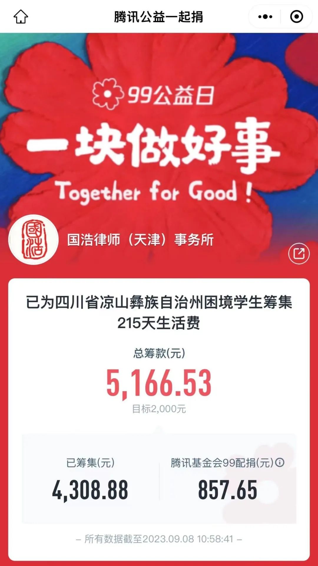 國浩天津自2020年成為四川省索瑪慈善基金會愛心理事會員單位后,每年對大涼山困境學生及希望小學進行不同形式的資助及物資捐贈。9月9日,國浩天津聯合四川省索瑪慈善基金會,共同發起“為大涼山困境學生捐助100天生活費2000元”募捐活動?;顒娱_始短短一小時,國浩天津的愛心捐款就已超過四千余元,加上配捐金額一小時共計募捐善款5,166.53元,遠遠超過計劃目標,此筆善款將使更多大涼山學生的生活得到改善。