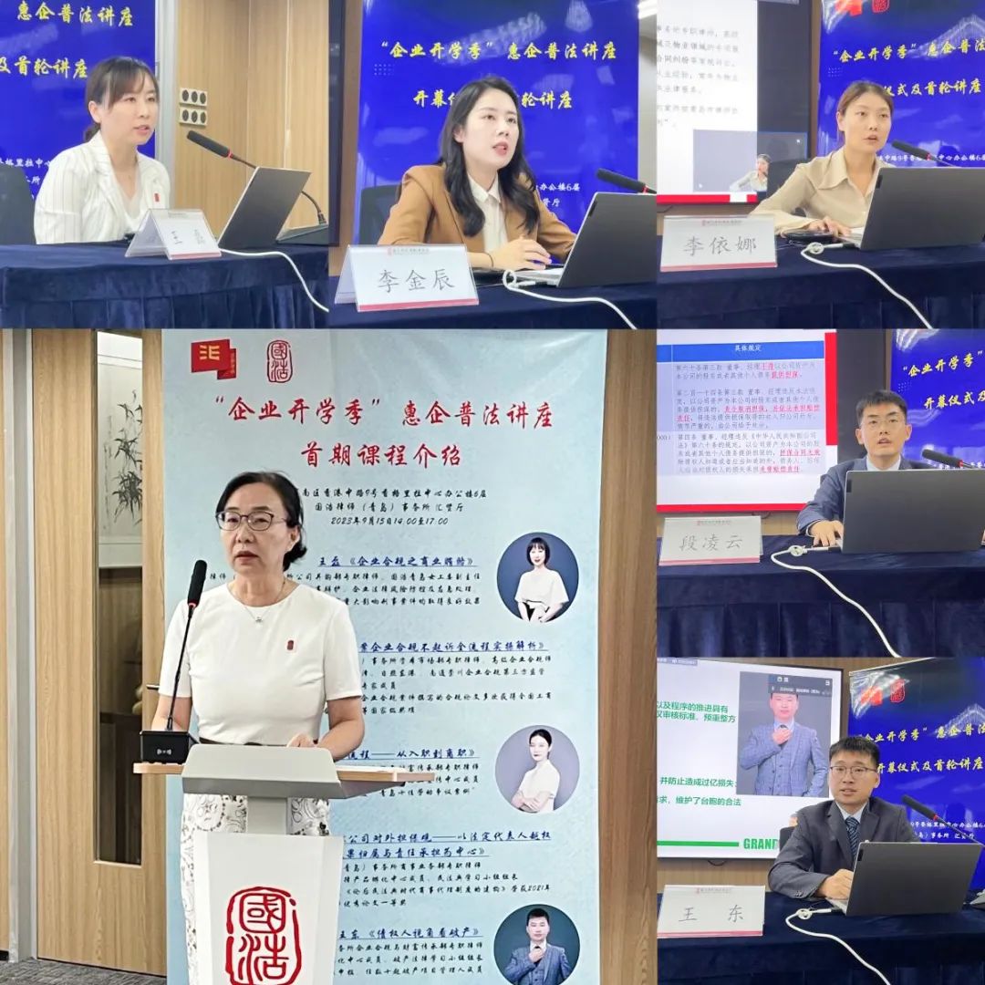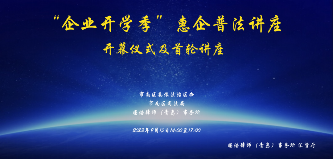 為深入貫徹落實青島市“深化作風能力優化營商環境暖心服務企業”專項行動要求,為企業發展提供更多切實的法律支持,2023年9月15日,由國浩律師(青島)事務所聯合青島市市南區委全面依法治區委員會辦公室、市南區司法局共同主辦,國浩青島工會、青工委、團支部、惠企助工宣傳中心、法律產品孵化中心聯合承辦的“企業開學季”惠企普法講座開幕儀式及首輪講座在國浩青島辦公室成功舉行。