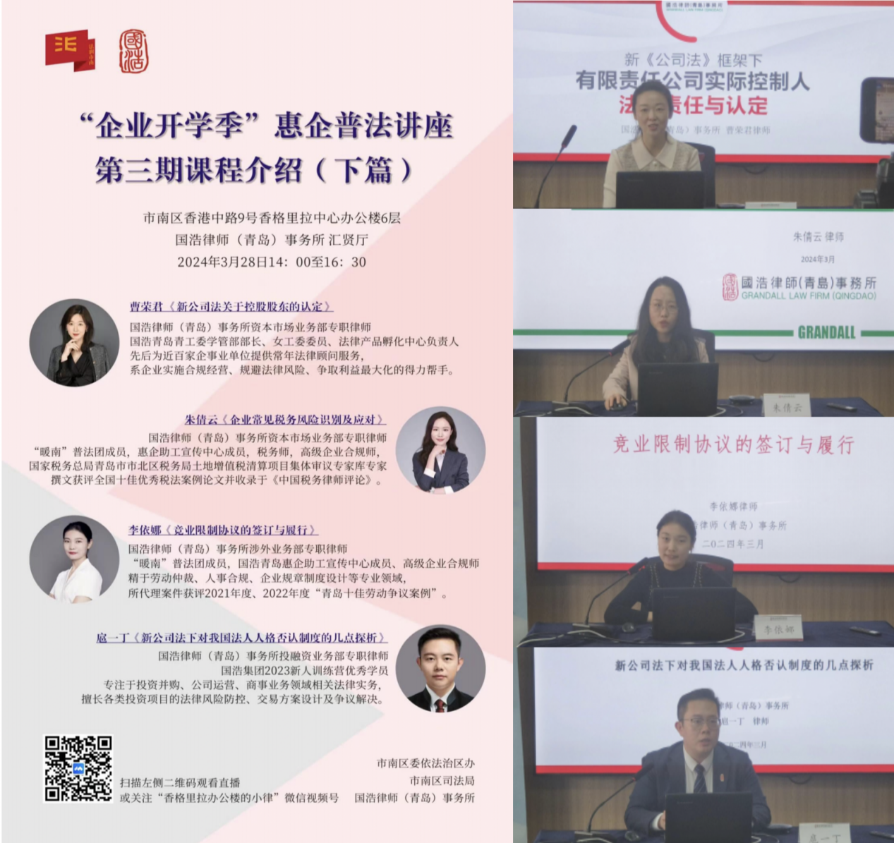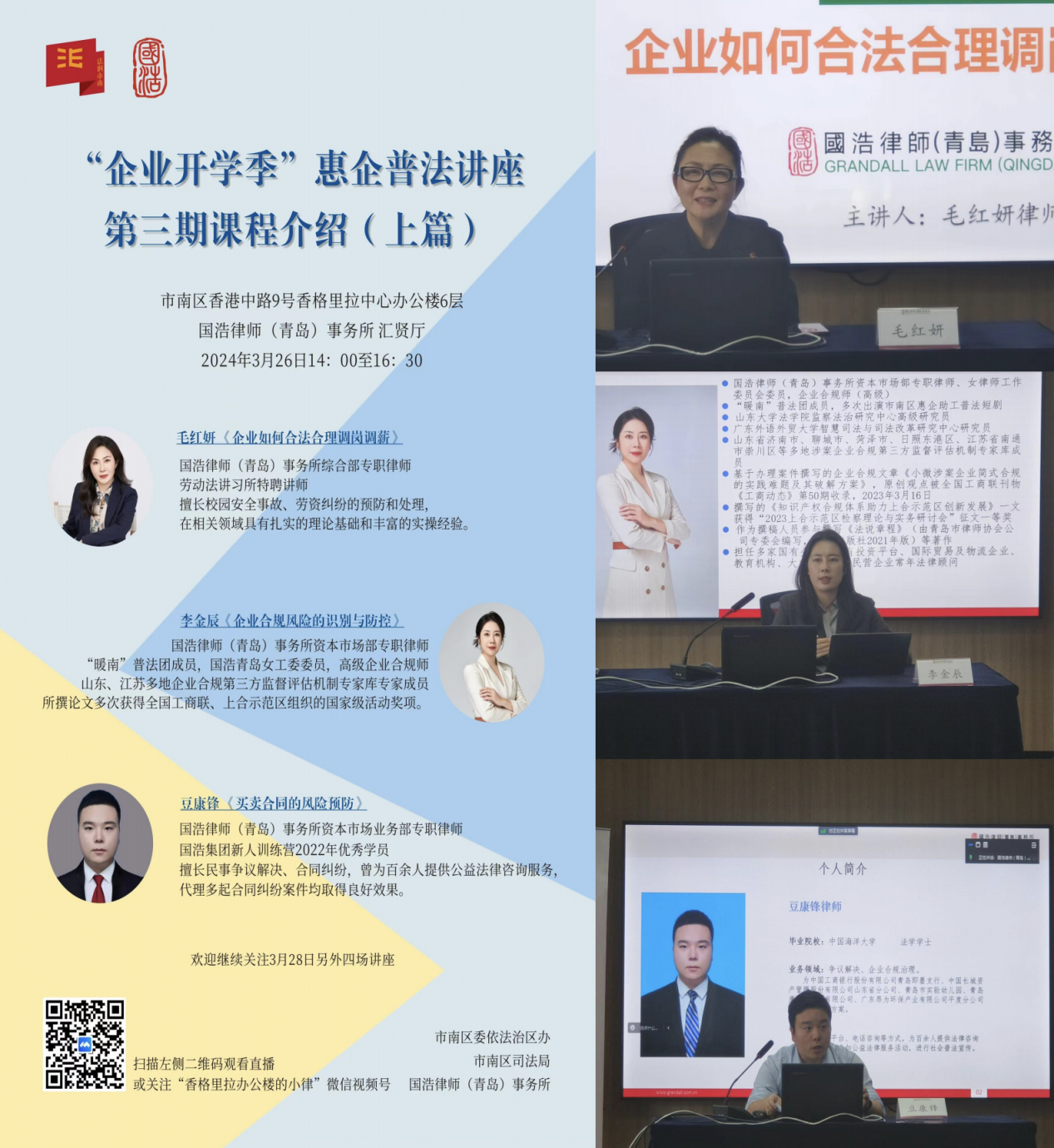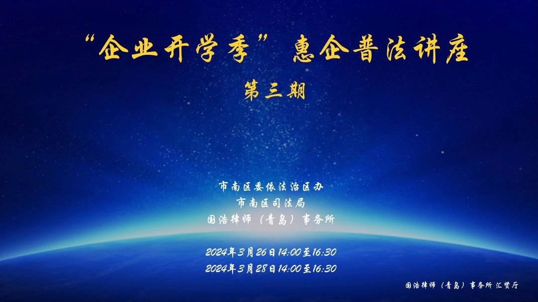 2024年3月26日、28日,適逢開學(xué)之際,“企業(yè)開學(xué)季”系列惠企普法講座活動如約而至。“企業(yè)開學(xué)季”系列惠企普法講座系國浩青島聯(lián)合青島市市南區(qū)委依法治區(qū)辦公室、青島市市南司法局以及湛山街道聯(lián)合推出的惠企法律服務(wù)品牌活動,在2023年已舉辦兩期,受到了當(dāng)?shù)卣c企業(yè)的一致好評。