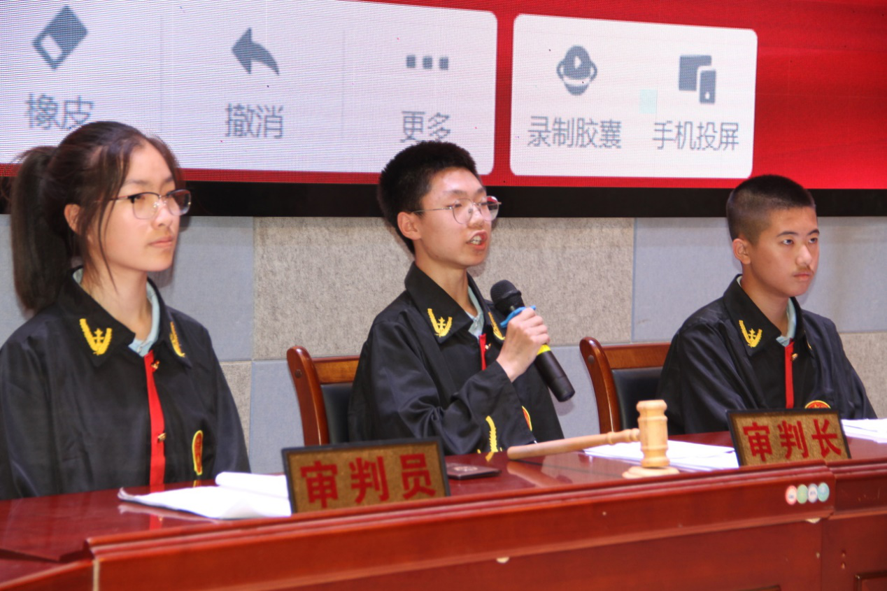 “庭審”過程中,14位同學分別化身為“書記員”“審判長”“審判員”“公訴人”“律師”“法警”和“被告”等不同角色。小“法官”們十分認真,神情動作話語有模有樣,嚴格按照真實庭審程序進行,整個模擬庭審過程嚴謹、規范、流暢,圓滿完成了從宣布開庭、法庭調查、法庭辯論、最后陳述、法庭宣判的司法工作流程。