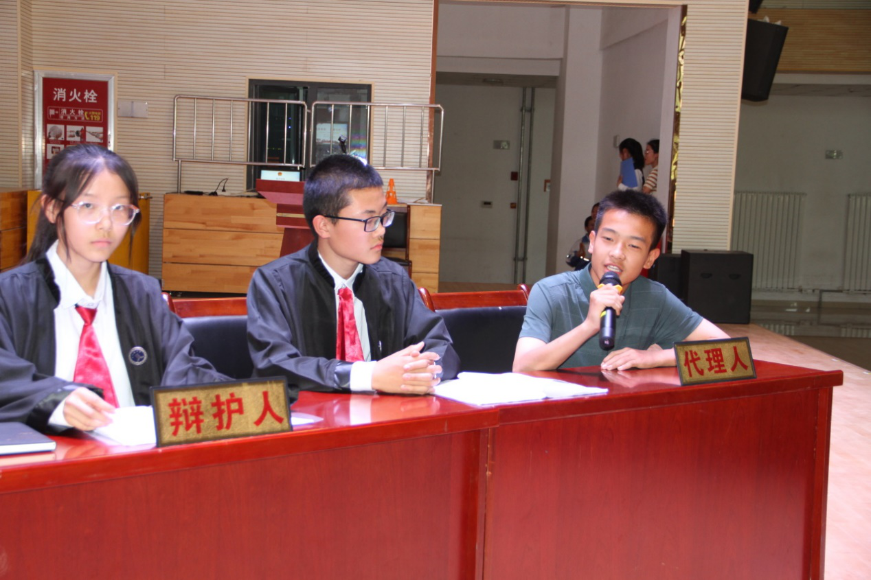 在高楊律師對案例、審判規則等進行簡單講解后,“現在開庭!”伴隨著清脆的法槌聲響,一場模擬“故意傷害案”的庭審活動正式開始。