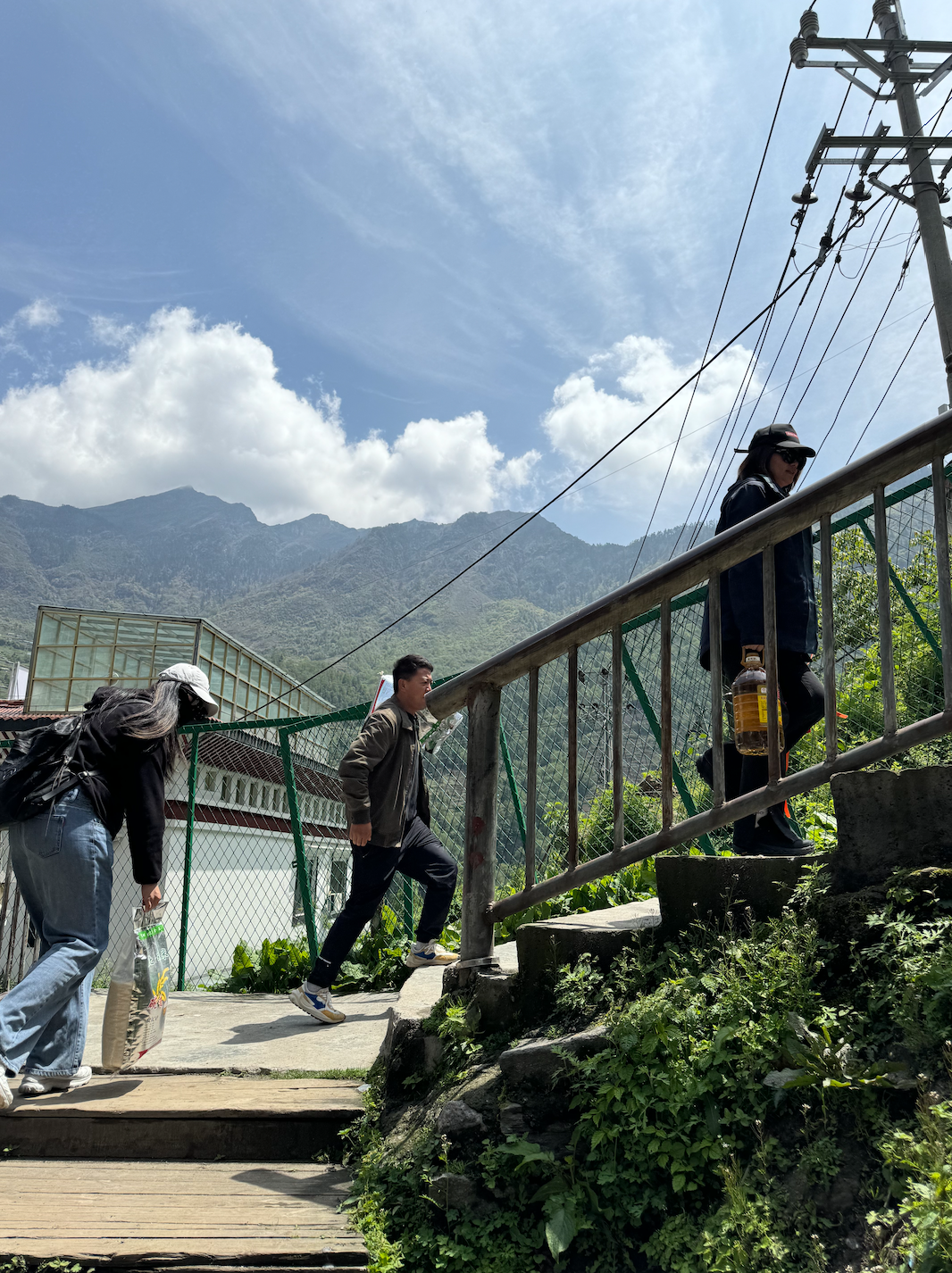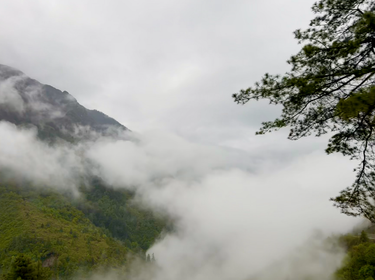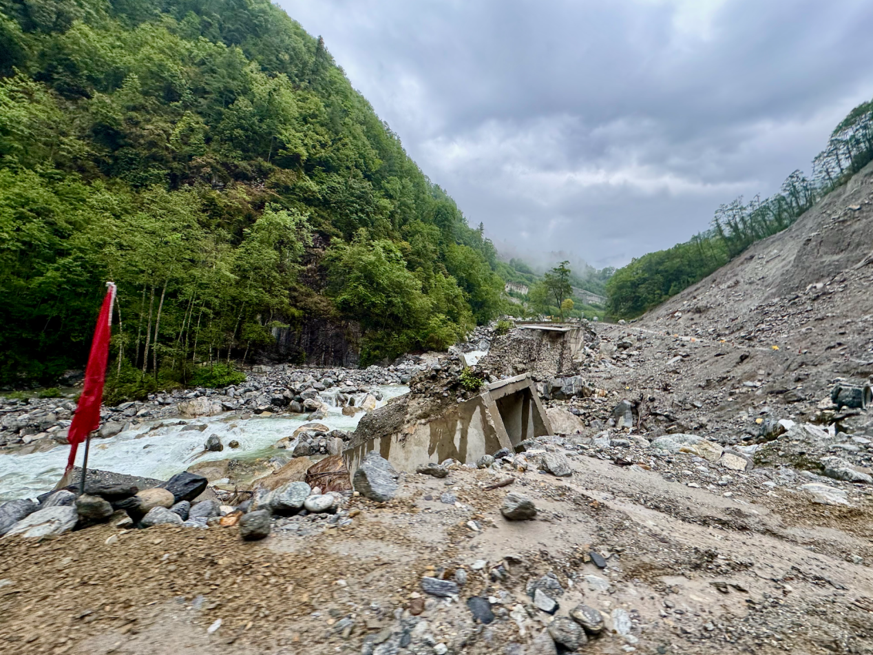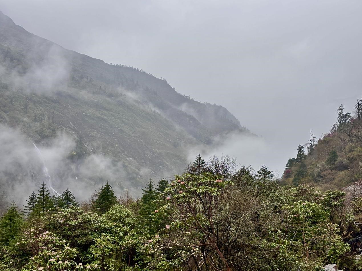 沿著云霧繚繞的原始森林從4900米下降到2020米,巨大的冰瀑掛在漫山的杜鵑花樹(shù)間,便來(lái)到了陳塘溝,比起2023年底國(guó)浩第三批援藏律師來(lái)陳塘溝承辦另一起法律援助案件時(shí)的路況,進(jìn)陳塘的道路更加險(xiǎn)峻了。
