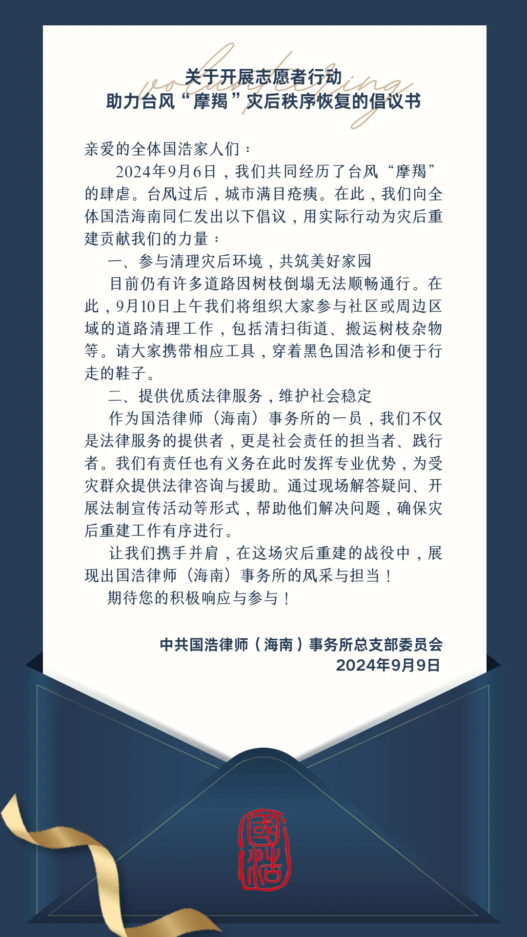 災后伊始,國浩海南黨總支迅速響應,向國浩海南全體同仁發起“關于開展志愿者行動 助力臺風‘摩羯’災后秩序恢復的倡議書”,號召大家用實際行動為災后重建貢獻力量!倡議發出后,反響熱烈,大家踴躍報名,希望凝聚力量參與到災后重建的各項工作中,助力重建美好家園。