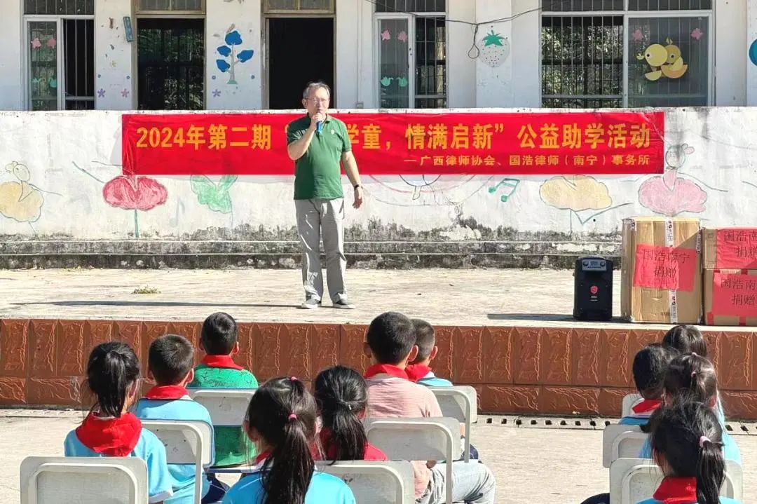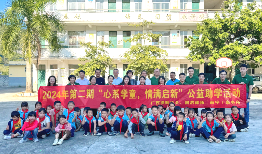 為學習貫徹習近平總書記關(guān)于廣西工作論述的重要要求,努力做黨和人民滿意的好律師。2024年11月1日,在國浩南寧管理合伙人李林輝、吳永文帶領(lǐng)下,廣西律師協(xié)會和國浩南寧律師組成公益助學活動小組前往廣西天等縣馱堪鄉(xiāng)啟新小學(以下簡稱“啟新小學”),開展了2024年第二期“心系學童,情滿啟新”公益助學活動,廣西律師協(xié)會會員部副主任徐柳萍參加活動。