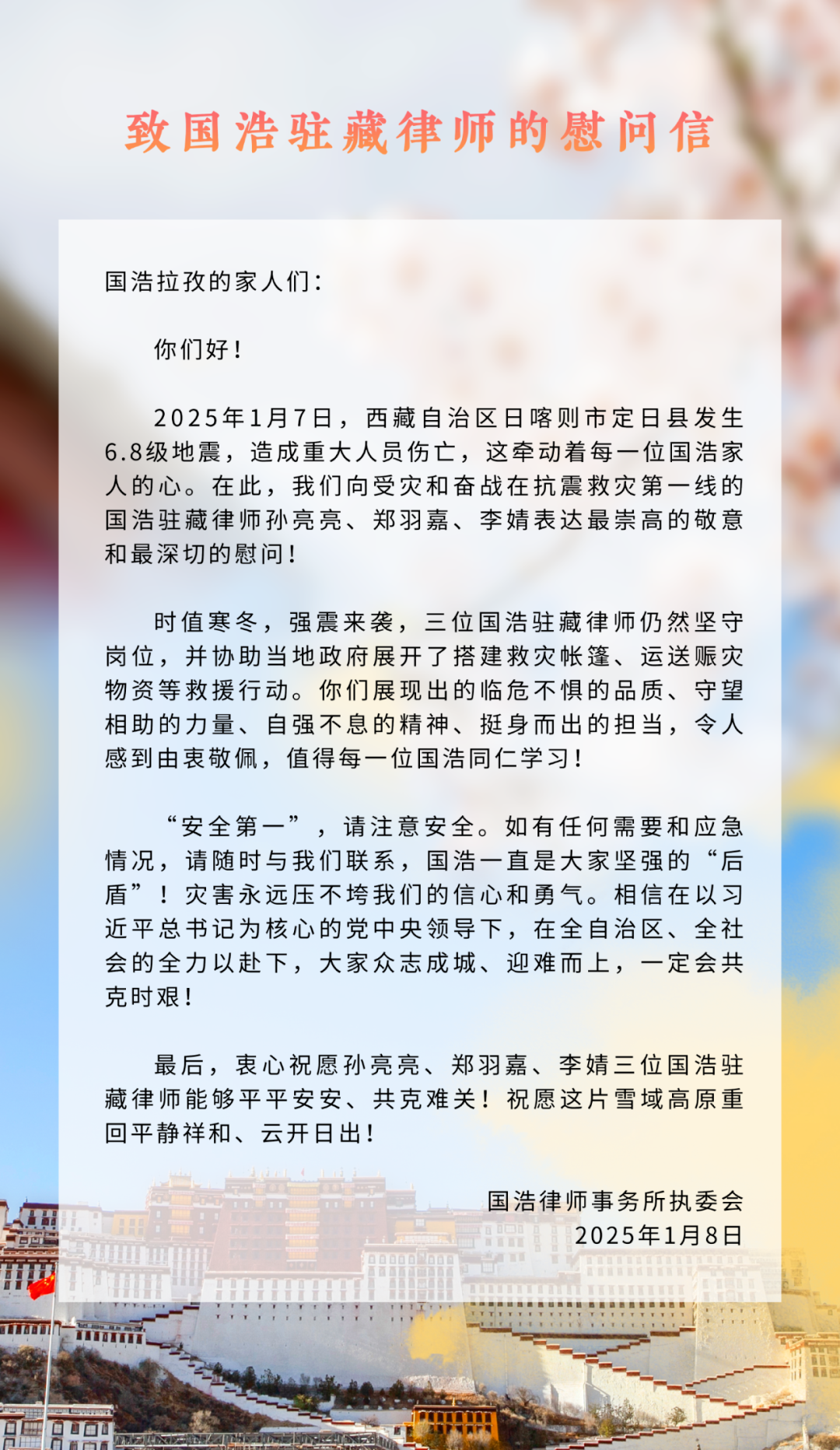 國浩律師事務所心系震區,第一時間與日喀則市司法局、市律師協會以及拉孜縣政府、縣司法局相關領導聯系了解情況,并表達關切與慰問;第一時間向三位駐藏律師發送了慰問信。國浩各職能部門以及深圳、天津、武漢辦公室也即時聯系到了三位國浩駐藏律師,只為聽到他們的一聲“平安”。