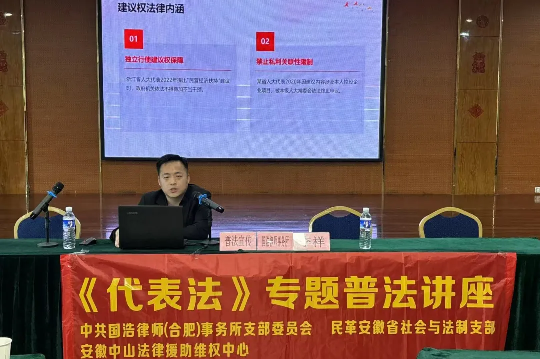 2025年適逢《中華人民共和國全國人民代表大會和地方各級人民代表大會代表法》(以下簡稱《代表法》)頒布實施33周年,為推動新修訂的《代表法》貫徹落實,增強人民群眾的法治意識,4月9日,國浩合肥黨支部攜手安徽中山法律援助維權中心(以下簡稱“中山法援”)走進合肥市蜀山區琥珀街道澤麗大酒店,聯合開展《代表法》普法宣傳講座。國浩合肥律師李祥,實習律師李薇,安徽中山法律援助維權中心工作人員、國浩合肥行政人員李鑫參加活動。