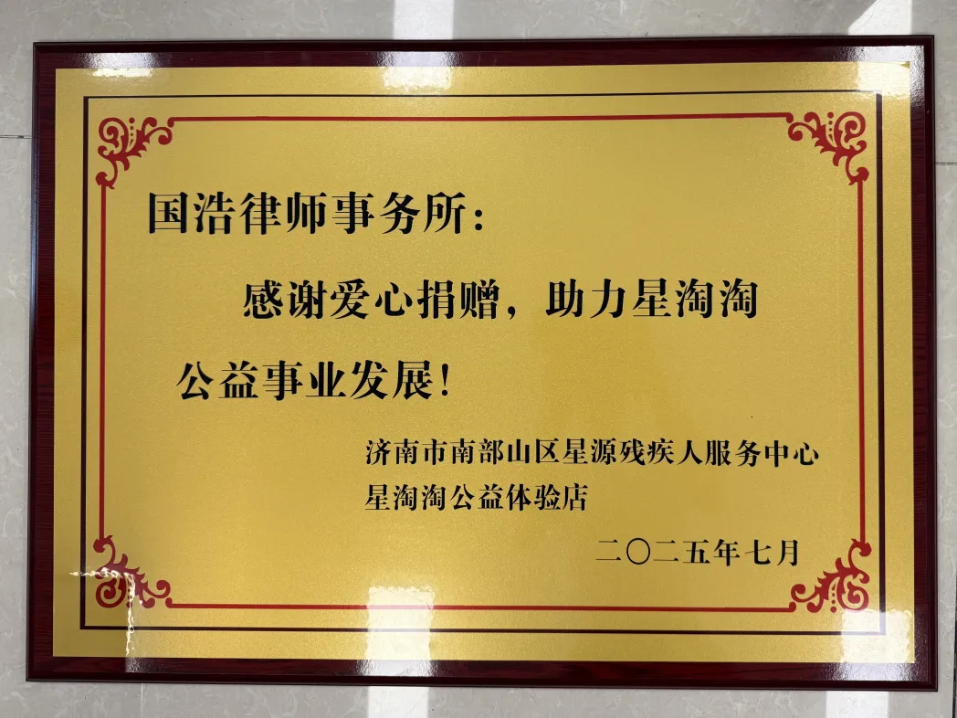 為深入踐行社會責任,弘揚公益精神,國浩濟南于2025年7月6日赴濟南市南山區仲官街道東泉瀘村,參加由星源殘疾人服務中心籌辦的星淘淘公益體驗店開業儀式,并通過捐贈物資、提供專業服務支持等方式助力殘疾人事業發展。開業儀式上,星源殘疾人服務中心還向國浩濟南授予了愛心捐贈牌匾以示感謝,國浩濟南合伙人黃現峰代表國浩濟南接受授牌。