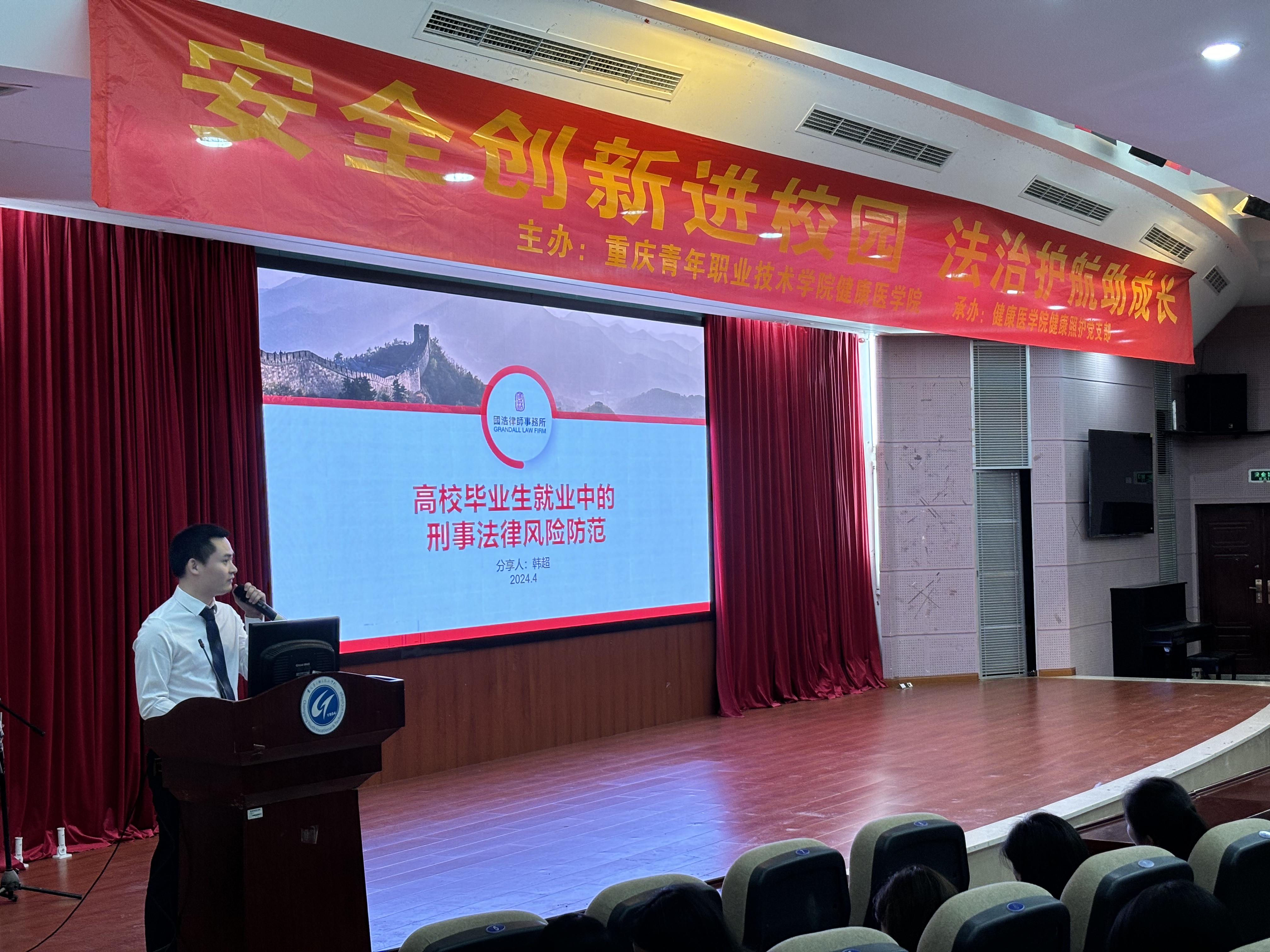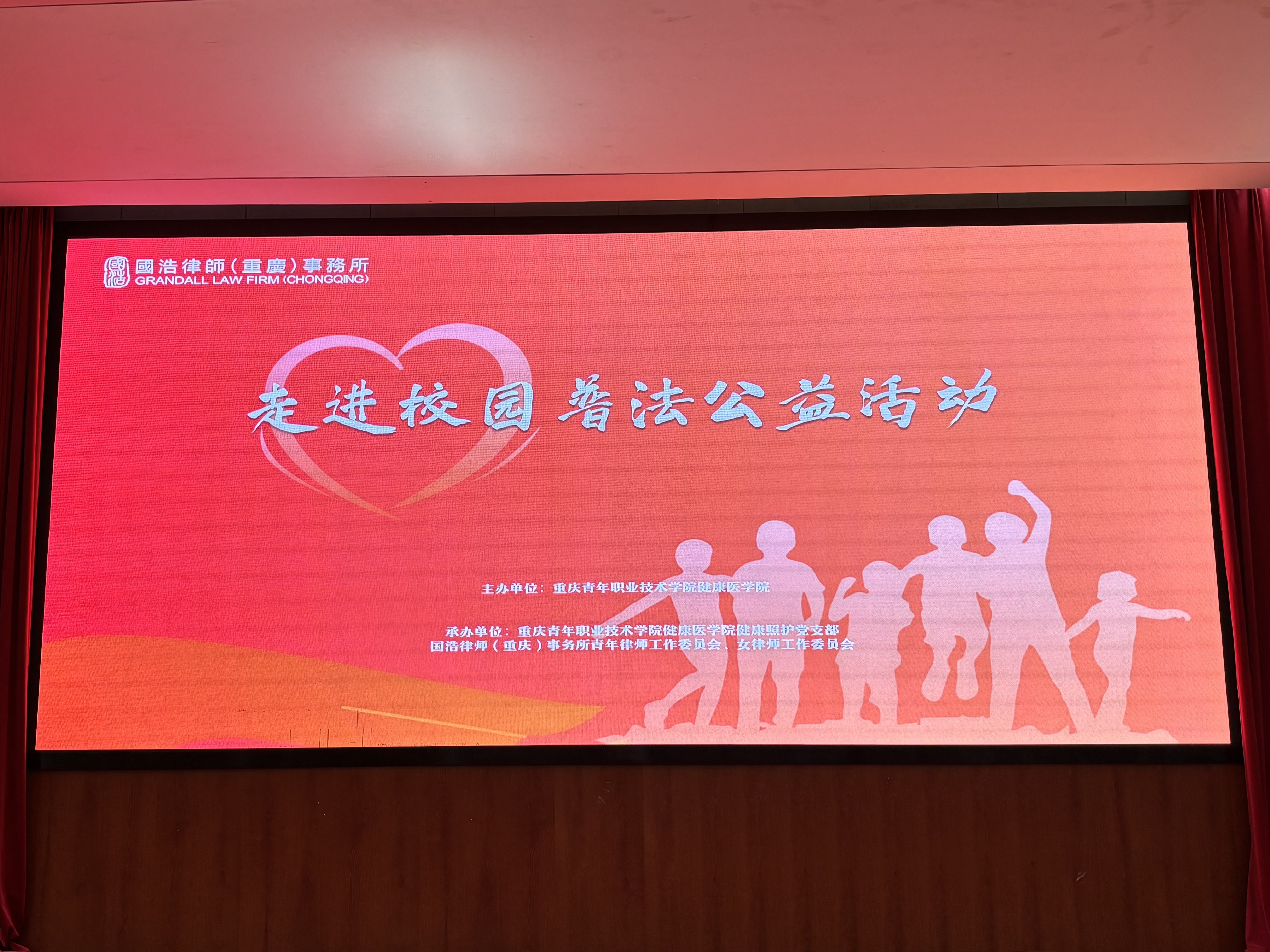 2024年4月19日,國浩重慶青年律師工作委員會、女律師工作委員會聯合重慶青年職業(yè)技術學院健康醫(yī)學院開展“走進校園”普法公益活動。國浩重慶女工委副主任、合伙人唐顯清,青工委主任、合伙人李佳倬,合伙人羅應巧,律師韓超、鐘秀桃參加本次活動。