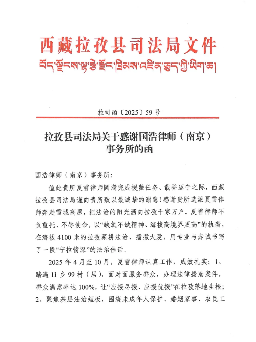 返程之際,西藏拉孜縣司法局向國浩深圳辦公室和國浩南京辦公室發來感謝信,這是當地政府部門及受助群眾對國浩律師的贊美與褒獎,也是法治中國最質樸的注腳。