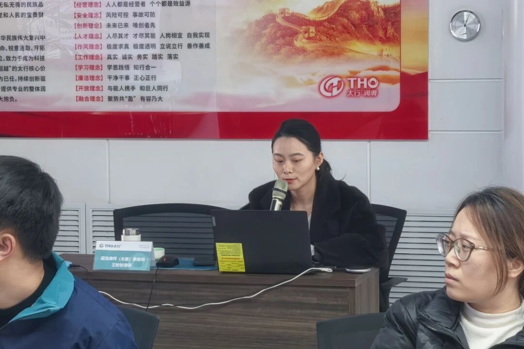 同日,國(guó)浩太原與太行潤(rùn)滑科技股份有限公司聯(lián)合舉辦“筑牢風(fēng)險(xiǎn)防線,賦能業(yè)務(wù)發(fā)展——合同管理全流程實(shí)務(wù)與案例精講”專題培訓(xùn)。國(guó)浩太原律師王盼盼系統(tǒng)講解了合同管理的整體框架、全流程中的風(fēng)險(xiǎn)防控要點(diǎn),結(jié)合案例進(jìn)行了深入剖析,并向參訓(xùn)人員發(fā)放“圖說憲法”宣傳頁(yè),以生動(dòng)直觀的形式闡釋憲法的核心要義與公民權(quán)利義務(wù),助力企業(yè)將法治思維融入日常經(jīng)營(yíng),以合規(guī)護(hù)航業(yè)務(wù)行穩(wěn)致遠(yuǎn)。