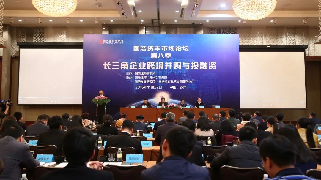 2016年11月27日,由國(guó)浩律師事務(wù)所主辦,國(guó)浩律師(蘇州)事務(wù)所、國(guó)浩發(fā)展研究院、國(guó)浩資本市場(chǎng)法律研究中心承辦的“國(guó)浩資本市場(chǎng)論壇·第八季:長(zhǎng)三角企業(yè)跨境并購(gòu)與投融資”在蘇州舉行。