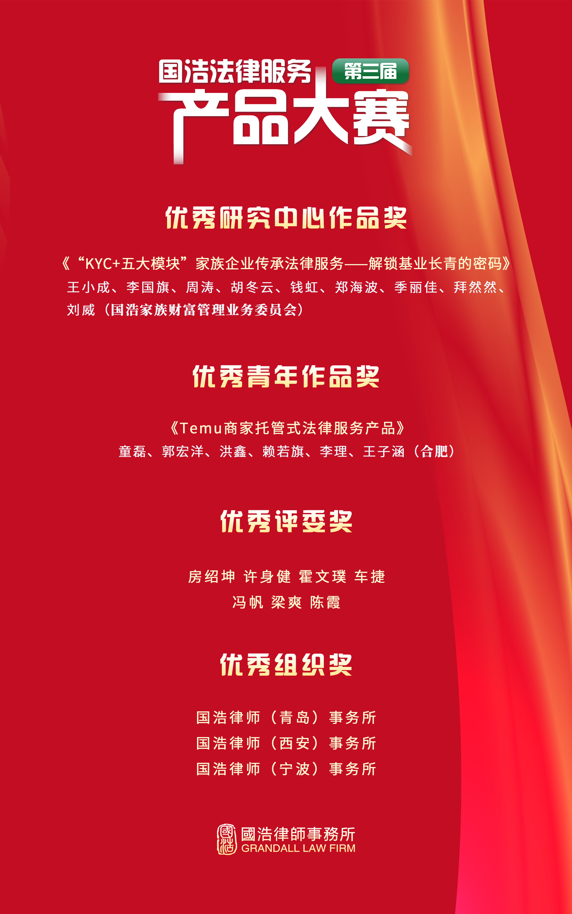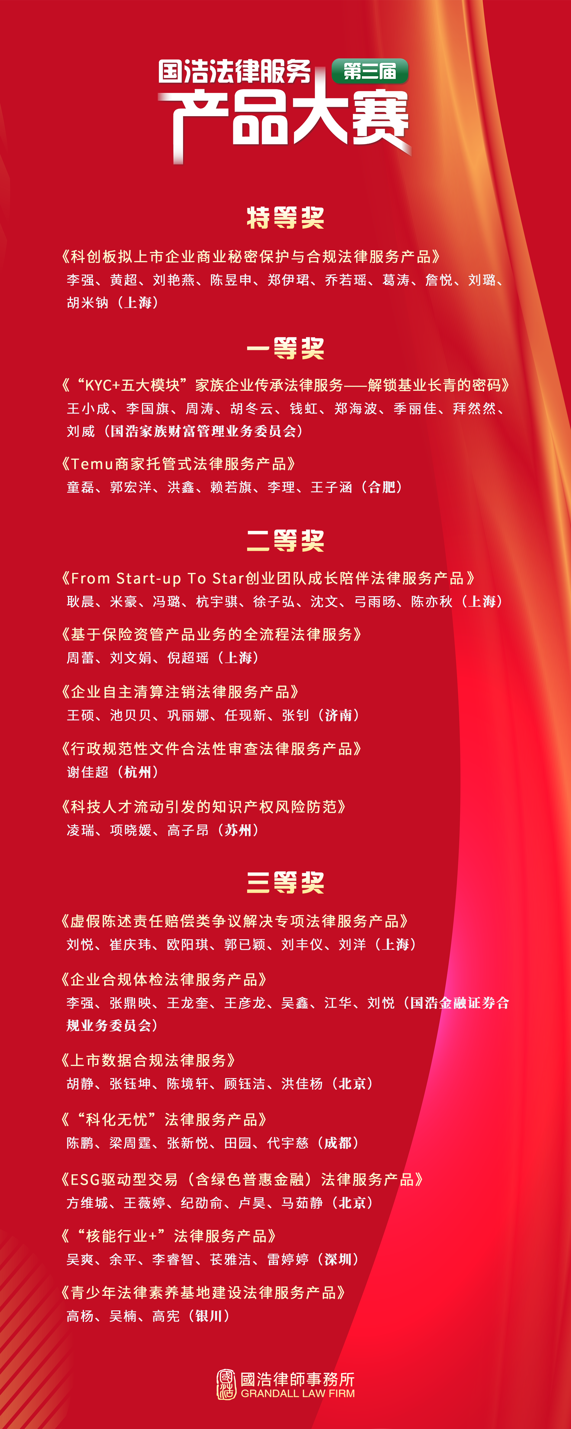 經過緊張激烈的現場比拼和專業較量,第三屆國浩法律服務產品大賽獲獎名單揭曉如下: