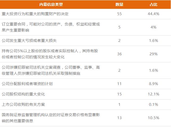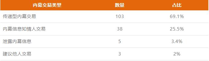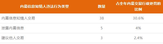 盡管內幕信息知情人直接進行內幕交易的案件比例有所降低,但其作為內幕信息之源頭,所涉違法形態多樣。如上表所示,內幕信息知情人直接進行內幕交易的比例占到了全年內幕交易行政處罰案件總數的30.6 %,同時,被認定為泄露內幕信息、建議他人交易的案件也不在少數。可以說,內幕信息知情人違法違規態勢依舊活躍。內幕信息知情人(最為典型的是上市公司董監高)是資本市場的“關鍵少數”,對上市公司負有法定的忠實勤勉義務。內幕信息知情人直接進行內幕交易的數量和比例尚且如此之高,說明相當部分資本市場參與者的法律合規意識仍十分淡薄,這其中可能有部分屬于無知違法。