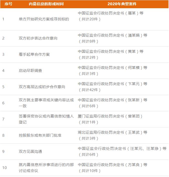 2020年內幕交易行政處罰案件中,有近一半的內幕交易案件發生在上市公司并購重組等重要經營投資活動中。并購重組一直被視為上市公司產業整合、轉型升級的“利好信息”,過程中涉及人員眾多、操作復雜,極易引發多環節泄露、多方泄露等違規風險。2020年涉及上市公司并購重組內幕交易的“窩案”并不少見,例如易見股份內幕交易窩案、鄔某林等內幕交易達安股份案等即是多環節泄露、多次傳遞,上市公司、交易對手方、中間人等多方人員參與的典型案例。