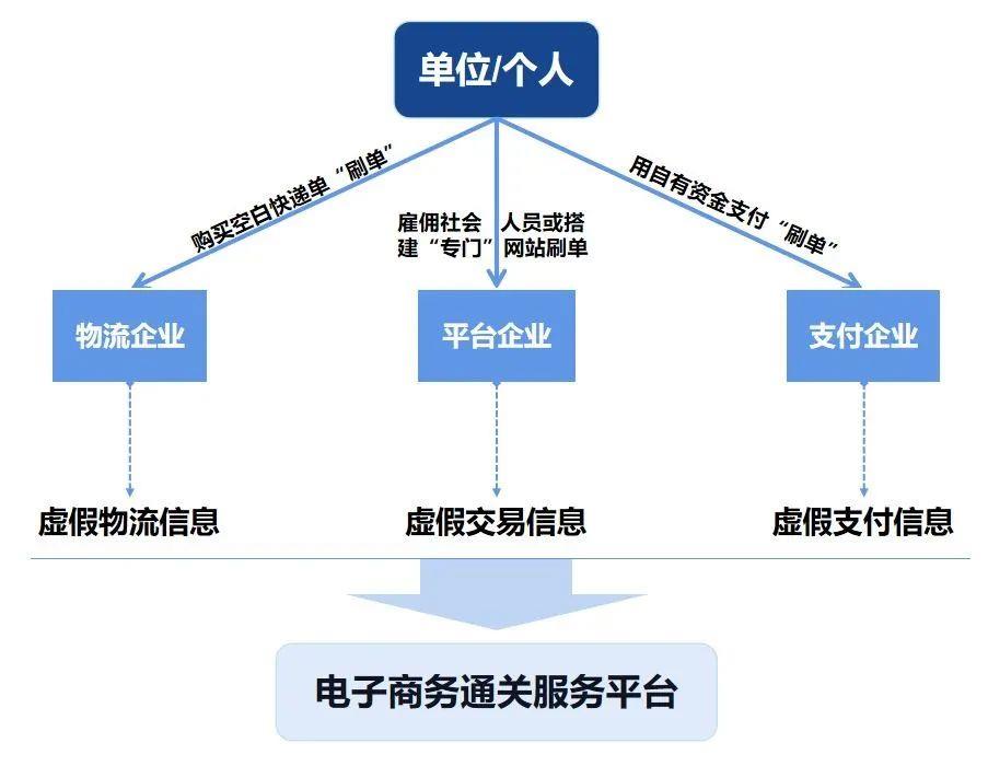 跨境電商運(yùn)營中的刷單,主要是將貨物進(jìn)行拆分,偽造個人訂單、快遞單和支付信息,“化整為零”將本應(yīng)以一般貿(mào)易方式進(jìn)口的貨物通過跨境電商走私入境,偽報貿(mào)易方式從而利用低稅率優(yōu)惠。具體流程如下圖所示: