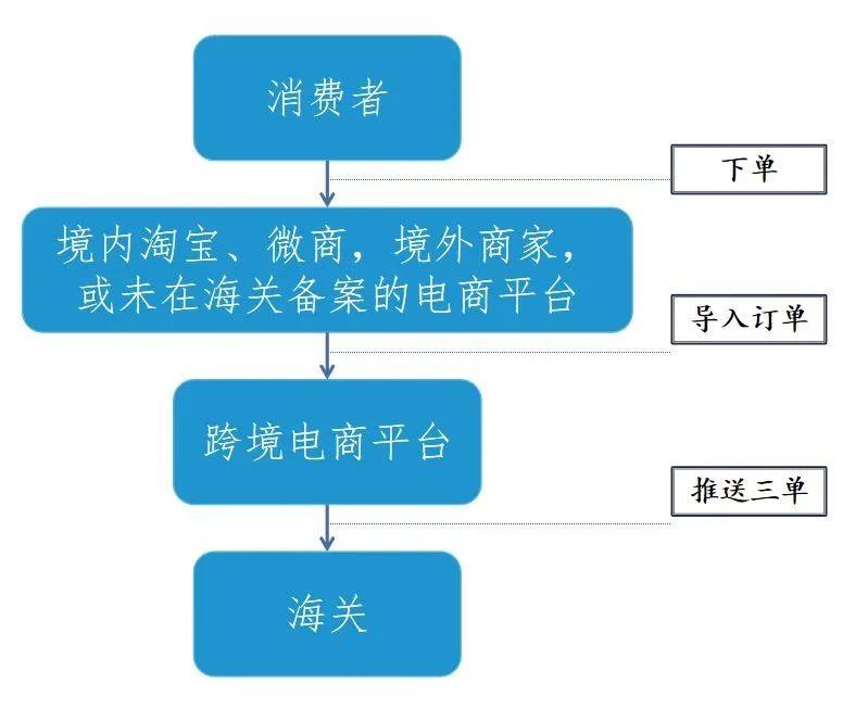 “推單”系跨境電商經(jīng)營者與境外商家,或境內(nèi)淘寶、微商等店鋪,或其他未在海關(guān)備案的電商平臺合作,將消費(fèi)者的真實(shí)訂單導(dǎo)入與海關(guān)聯(lián)網(wǎng)的跨境電商平臺,根據(jù)導(dǎo)入的真實(shí)訂單匹配支付單和物流單,并將“三單”信息推送給海關(guān),最終以跨境電商零售進(jìn)口模式將境外商品申報入境并直接寄送至下單的消費(fèi)者。具體流程如下圖所示: