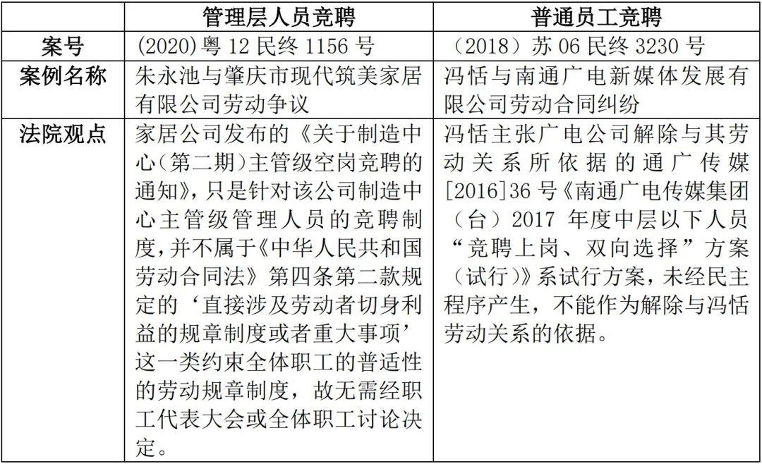 通過對比司法實踐中的觀點,法院認為針對競聘上崗制度是否屬于《勞動合同法》第四條第二款規定的“有關勞動報酬、工作時間、休息休假、勞動安全衛生、保險福利、職工培訓、勞動紀律以及勞動定額管理等直接涉及勞動者切身利益的規章制度或者重大事項”,其區別主要是競聘者是否為公司管理層人員。