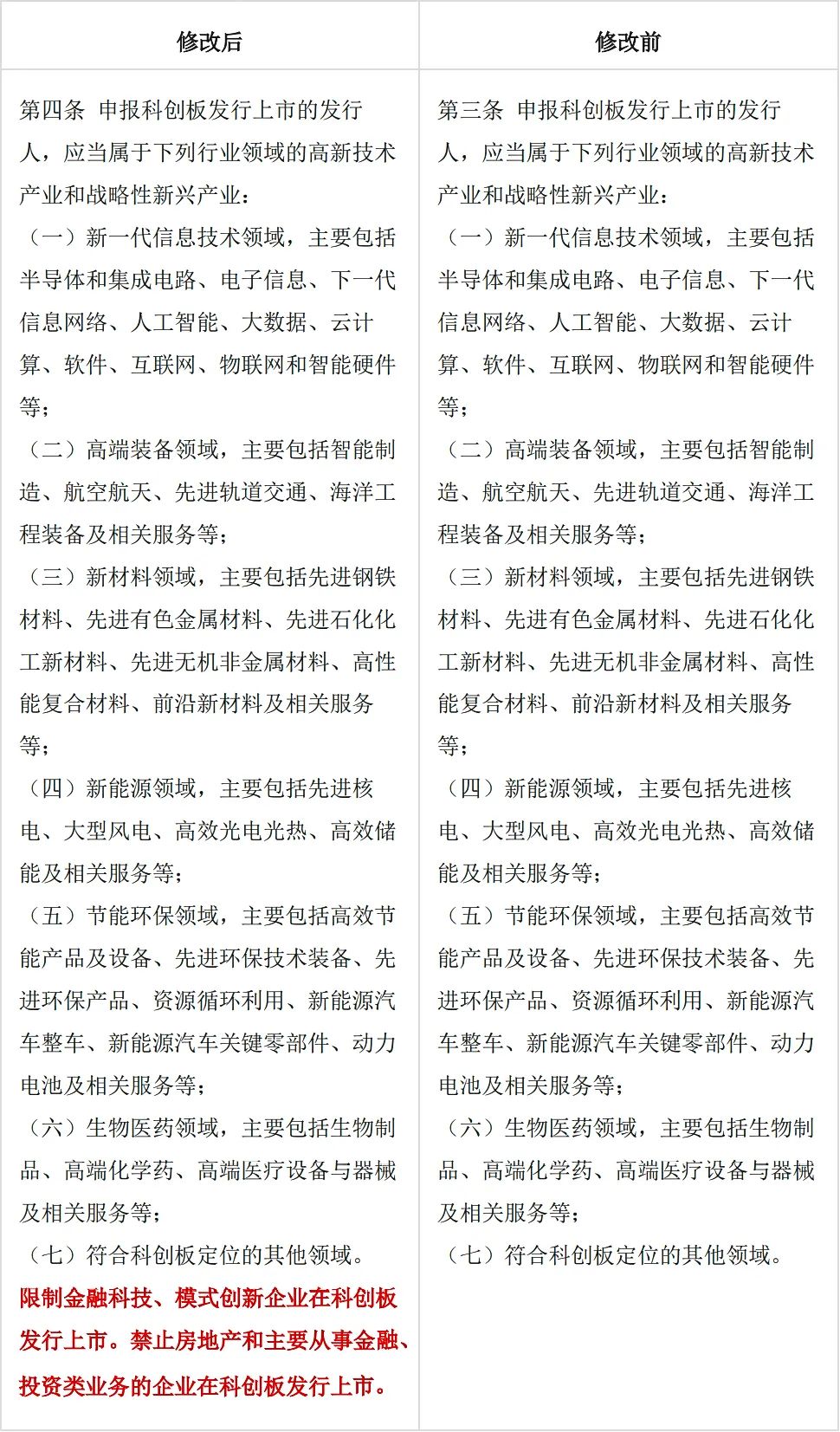 根據證監會發布的信息:“此次修訂旨在完善科創屬性評價指標體系,總體思路是:聚焦支持‘硬科技’的核心目標,突出實質重于形式,實行分類處理和負面清單管理,進一步豐富科創屬性評價指標并強化綜合研判。壓實中介機構責任,強化制度規則執行情況的監督檢查,從源頭上提高科創板上市公司質量。”