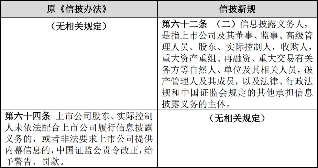 信披新規新增了關于信息披露義務人具體范疇的規定,第62條明確了信披義務人不僅包括上市公司及其董監高,還包括上市公司股東、實控人,收購人,重大資產重組、再融資、重大交易有關各方等主體,以及破產管理人及其成員等主體。原《證券法》第63條雖然著重強調了發行人和上市公司的信披義務,但同時也弱化了上市公司股東及交易對手方等主體的信披責任,新《證券法》第78條在信披義務人范圍的界定上,突破了以發行人和上市公司為第一責任人的規制邏輯,確立了以“信息披露義務人”為規制對象的監管原則,信披新規第62條則在新《證券法》第78條原則性規定的基礎上作了進一步細化。