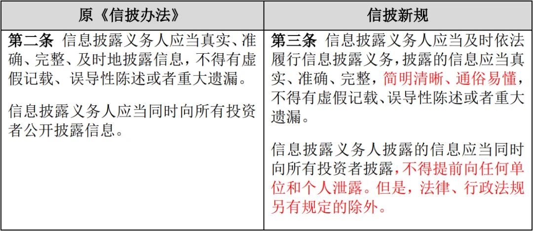 信披新規第3條完善了信息披露的基本原則:一是完善了信息披露公平原則,保障信息披露對所有投資者一視同仁;二是新增了“簡明清晰、通俗易懂”之要求,增強公告內容的可讀性和易懂性。
