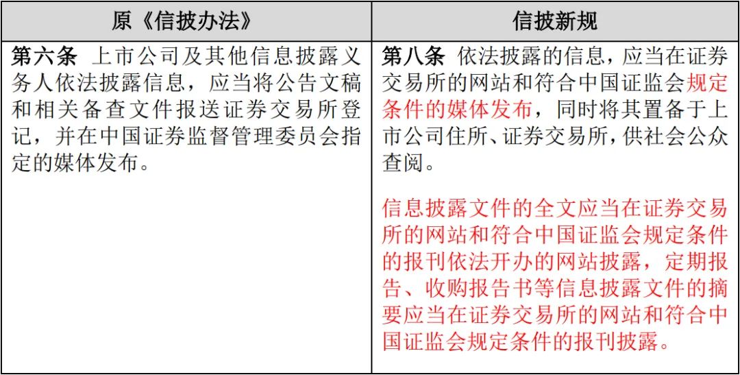 信披新規第8條明確,關于定期報告、收購報告書等文件,僅摘要需要在證券交易所的網站和符合中國證監會規定條件的報刊披露,其他內容在交易所的網站和符合中國證監會規定條件的報刊依法開辦的網站披露即可。這一修訂區分不同信息的披露渠道,降低了上市公司信披成本,提升了上市公司信披效率。