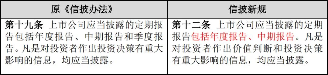 信披新規第12條調整了需要披露的定期報告的范圍,刪除了原《信披辦法》里有關季度報告的相關規定,明確了定期報告包括僅包括年度報告和中期報告。但需注意,季度報告的披露由交易所在其業務規則中明確,上交所、深交所相關規則中均對季度報告的披露作出了詳細規定,現行披露制度對投資者知情權的保護力度并未降低。