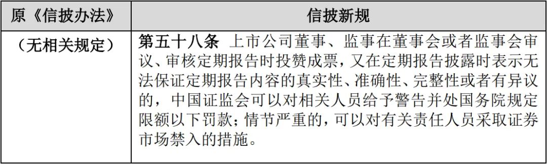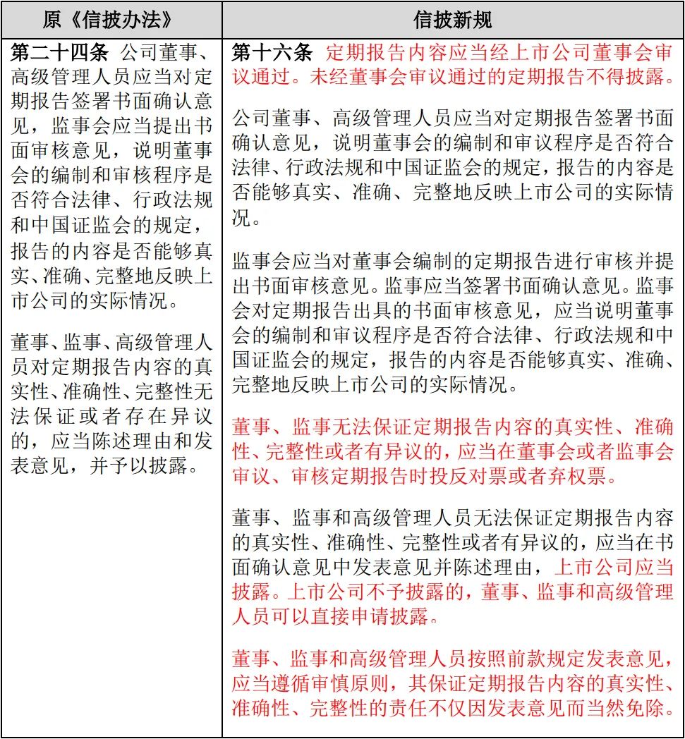 信披新規第16條完善了董監高異議聲明制度。第一,明確了未經董事會審議通過的定期報告不得披露。第二,董事、監事無法保證定期報告內容的真實性、準確性、完整性或者有異議的,應當在董事會或者監事會審議定期報告時投反對票或棄權票。第三,董監高無法保證定期報告內容的真實性、準確性、完整性或者有異議的,應當在書面確認意見中發表意見并陳述理由,發表意見應遵循審慎原則。