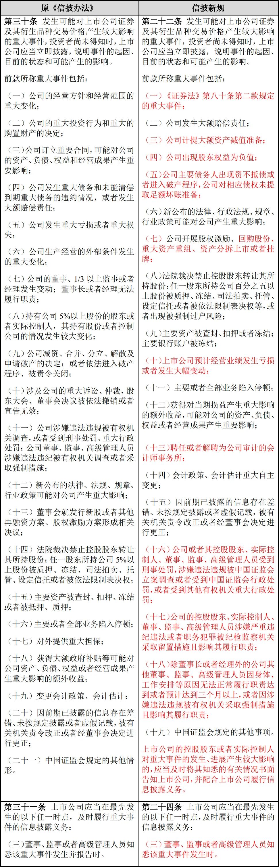 此外,信披新規修改了上市公司重大事件披露時點。相較于原《信披辦法》第31條將董監高“知悉該重大事件發生并報告時”作為披露時點,信披新規第24條規定當董監高“知悉該重大事件發生時”,上市公司即觸發披露義務。通過對比可發現,上市公司臨時報告的時點進一步提前,信息披露的及時性進一步增強。