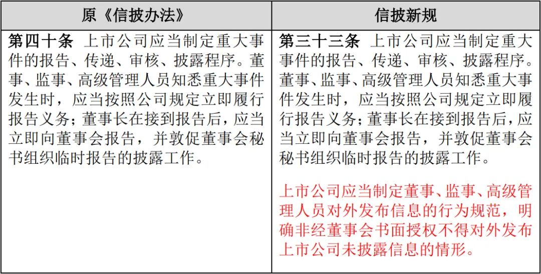信披新規第33條新增了對于董監高對外發布信息行為的規制,規定上市公司應當制定董監高對外發布信息的行為規范,明確非經董事會書面授權不得對外發布未披露信息的情形。近年來,常見上市公司高管動輒發布有關業績目標的“豪言壯語”或者泄漏尚未公開的重要信息,信披新規針對該等現象進行了專門規制,填補了規則空白。上市公司高管往往既是公司領航者,又是行業專家,在公共場合發表自身看法無可厚非,但是由于其身份特殊性,需結合發布信息的時間、地點、內容等,謹慎為之,不可過于隨性。