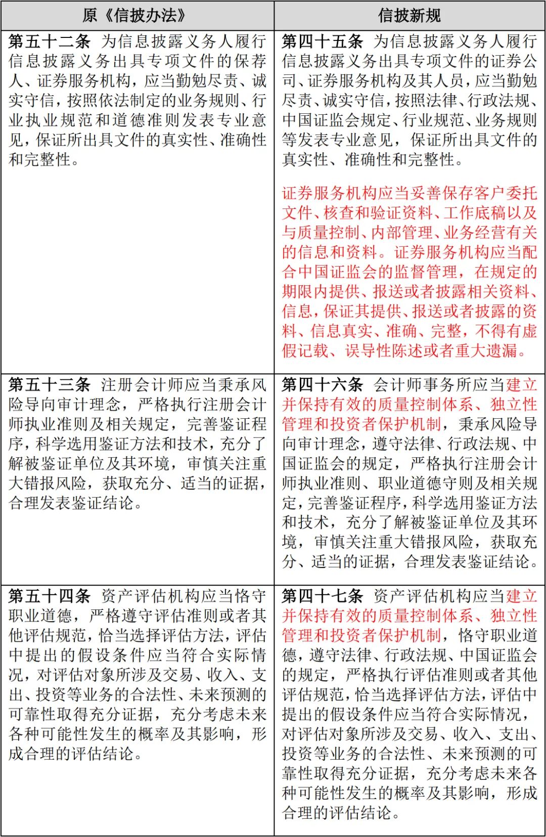 信披新規對于證券服務機構新增了妥善保存客戶委托文件、內部管理、業務經營等工作底稿的要求,并對其新增了配合證監會監管的義務。此外,在執業規范方面,信披新規對于會計師事務所、資產評估機構新增了質量控制體系、獨立性管理和投資者保護機制方面的要求。