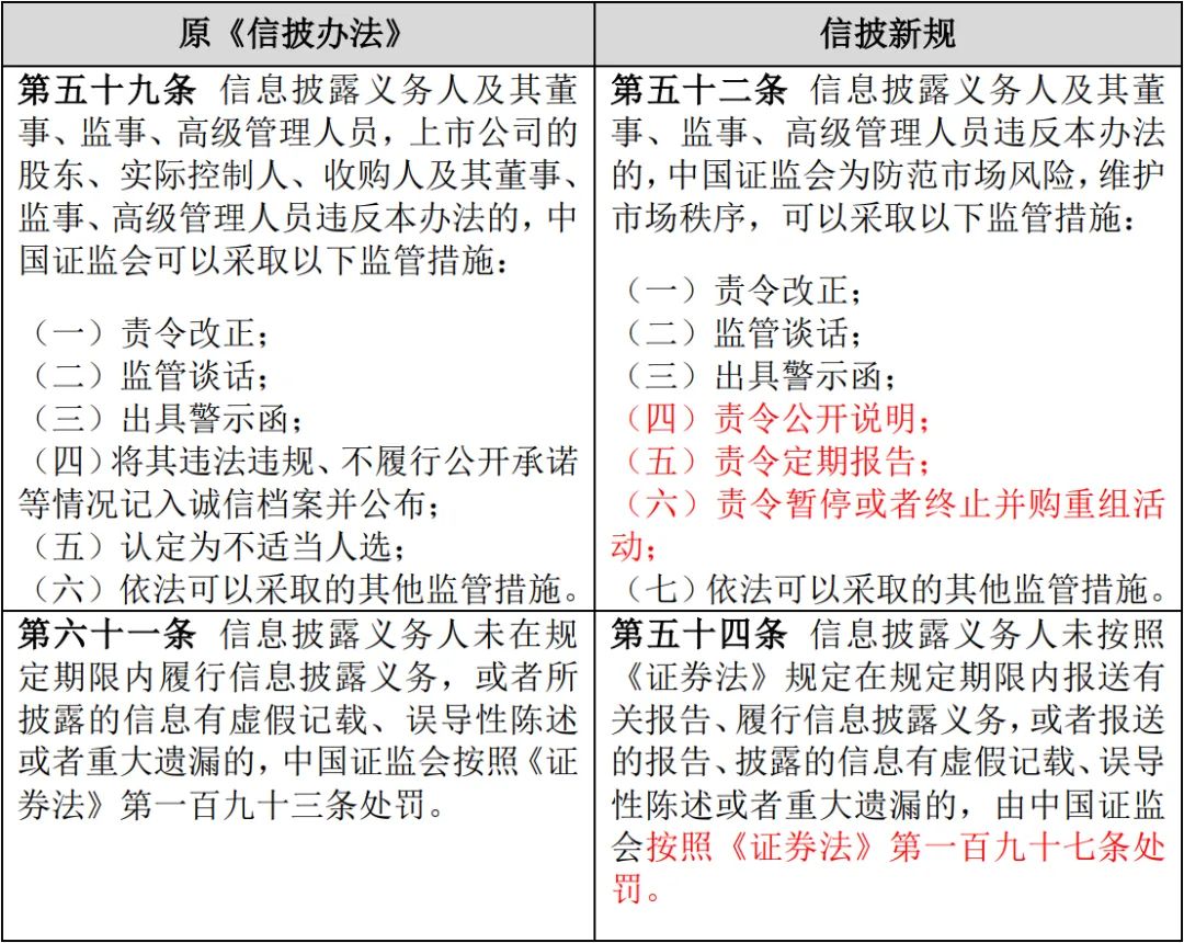 關于監管措施類型,信披新規第52條保留了原《信披辦法》中的責令改正、監管談話、出具警示函三類措施,新增了責令公開說明、責令定期報告、責令暫停或者終止并購重組活動三類措施,并刪除了記入誠信檔案的監管措施。關于處罰依據,信披新規第54條將信披違規的處罰依據由原《證券法》第193條更新為新《證券法》第197條,即信披違規罰款金額由原來的60萬元頂格處罰上升至1000萬元。