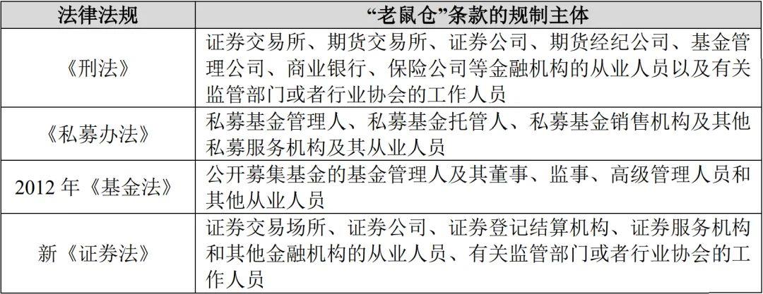 縱觀“老鼠倉”的立法,我國經歷了從行政立法缺位到刑事立法先行,再到行政立法跟進的演進過程。行政立法則是先規制公募“老鼠倉”到規制私募“老鼠倉”再到證券法整體規制。[注10]具體而言,《刑法修正案(七)》、2012年《基金法》《私募辦法》及新《證券法》相繼出臺,兩高《關于辦理利用未公開信息交易刑事案件適用法律若干問題的解釋》(以下簡稱“《兩高解釋》”)等司法解釋也陸續公布。多層次、多方位、多角度的立法在一定程度上對“老鼠倉”違法行為產生了有效的威懾,但相關條款也導致了理論和實踐的爭議,下文圍繞其中法律要點展開辨析。