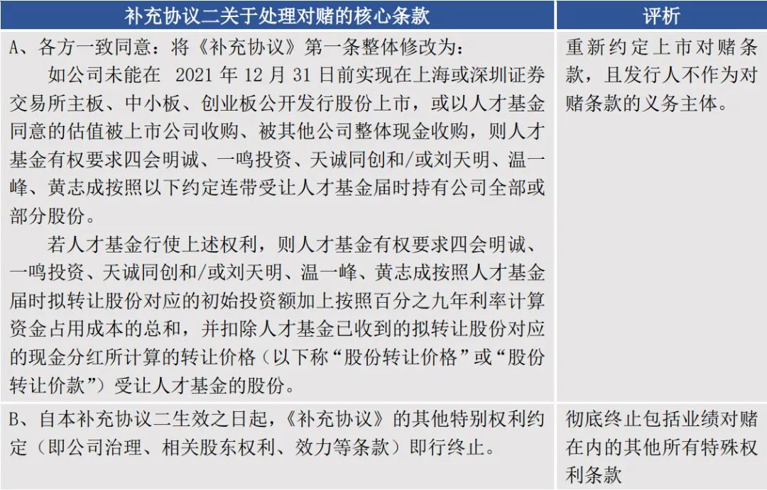 此外,筆者亦注意到,就對賭協議未解除的原因,IPO律師以“人才基金為控制風險,實現國有資產保值增值,上述補充協議未終止回購條款”為由進行答復。由此可見,對賭協議未終止,需要具備充分且合理的理由。