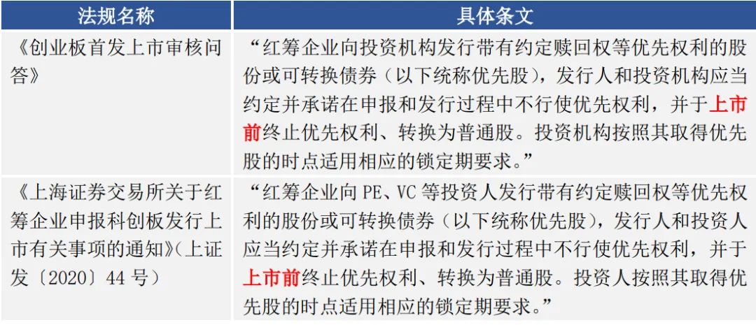 筆者注意到,上述規定為紅籌企業對賭協議的處理提供相對包容的空間。具體而言,若紅籌企業上市之前對賭協議中采用向投資人發行優先股等方式的,監管層允許該等對賭協議中優先權利特別安排于申報前不清理,但發行人和投資機構應承諾在申報和發行過程中不行使優先權利,并于“上市前”終止優先權利、轉換為普通股。此外,明確前述轉換后的股份不視為“突擊入股”,如無其他法定情形,無需鎖定36個月。