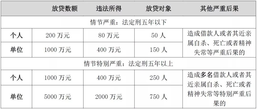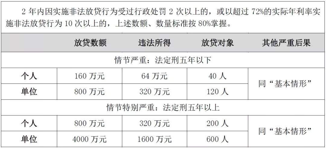 個人、單位在2年內2次以上因非法放貸被行政處罰,或者以72%的高利放貸10次以上的,入罪的數額、數量標準按基本情形的80%掌握;黑惡勢力非法放貸的,其入罪的數額、數量標準按基本情形的50%、特別情形的40%掌握。