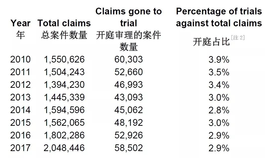 表格很清楚地反映出在法院受理的案件中,最終開庭的比例很小,而且總體趨勢是逐年降低的??紤]到很多案件會跨年度,即使從動態的角度來考慮,開庭的比例也很低。另外,英國政府的官方網站還登載了2018年各個季度的臨時數據,各項數據及比例比與2010-2017年數據并無實質性差異。
