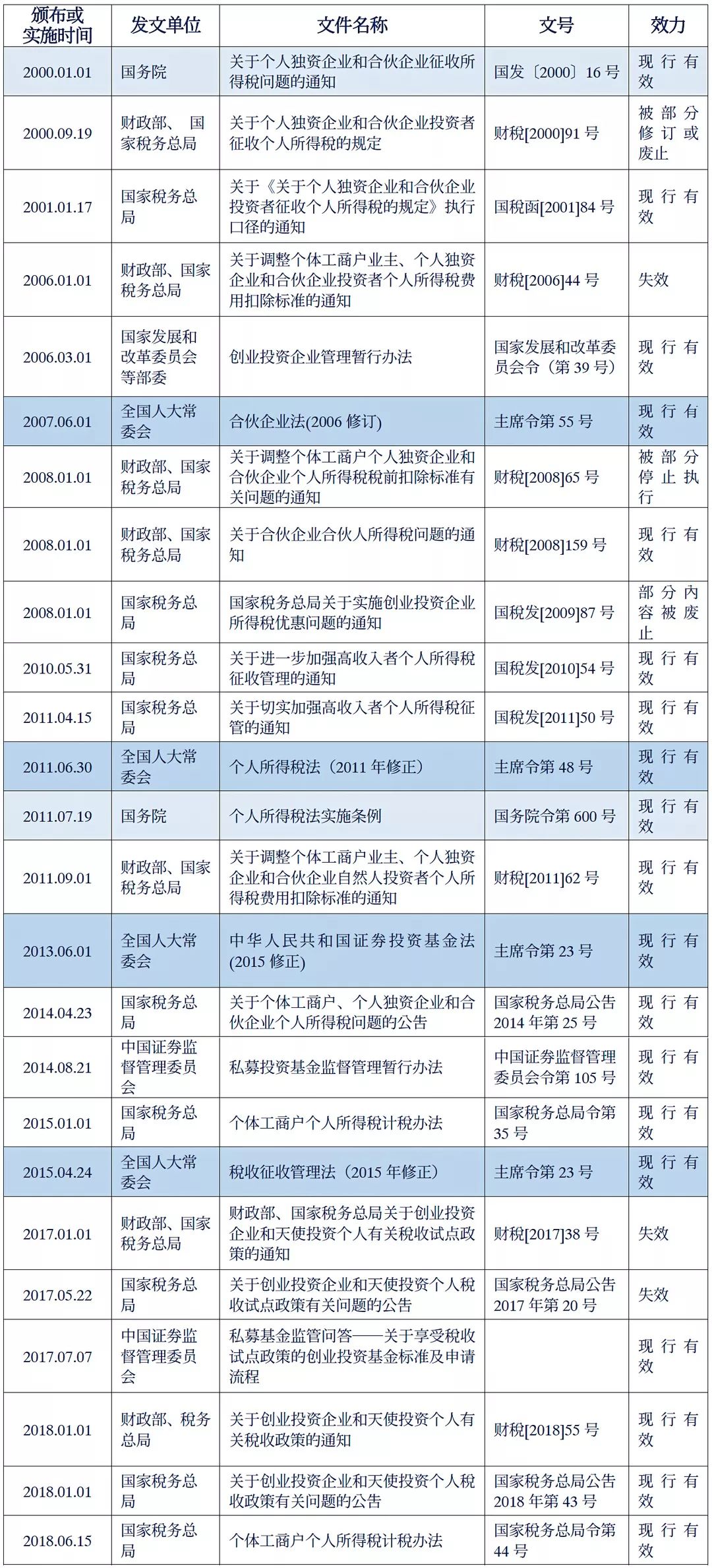 《國務院關于個人獨資企業和合伙企業征收所得稅問題的通知》(國發〔2000〕16號):自2000年1月1日起,對個人獨資企業和合伙企業停止征收企業所得稅,其投資者的生產經營所得,比照個體工商戶的生產、經營所得征收個人所得稅。具體稅收政策和征稅辦法由國家財稅主管部門另行制定。