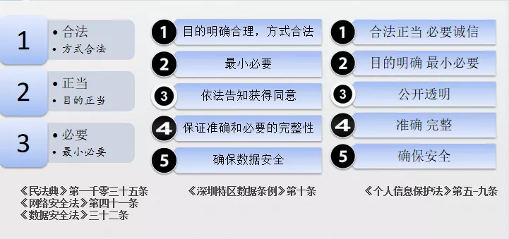 在整個數據處理活動中,數據處理者都需要遵循一定的原則,在原則的基礎之上就各個階段還應遵守特別的規定。各階段應當遵守原則,《民法典》第一千零三十五條、《網絡安全法》第四十一條、《數據安全法》三十二條概括為合法、正當、必要,這也是廣為流傳和接受的數據保護三原則。《特區條例》第十條將保護原則規定為:目的明確合理、方式合法、最小必要、依法告知獲得同意、保證準確和完整、確保數據安全。