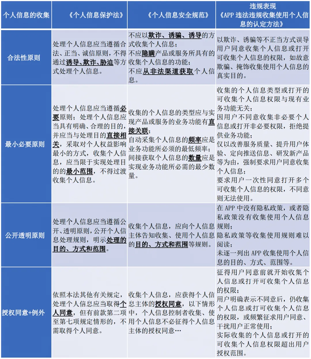 1. 確保合法性,不應以欺詐、誘騙、誘導的方式收集個人信息;不應隱瞞產品或服務所具有的收集個人信息的功能;不應從非法渠道獲取個人信息。相對應的違規表現則是以欺詐、誘騙等不正當方式誤導用戶同意收集個人信息或打開可收集個人信息的權限,如故意欺騙、掩飾收集使用個人信息的真實目的。