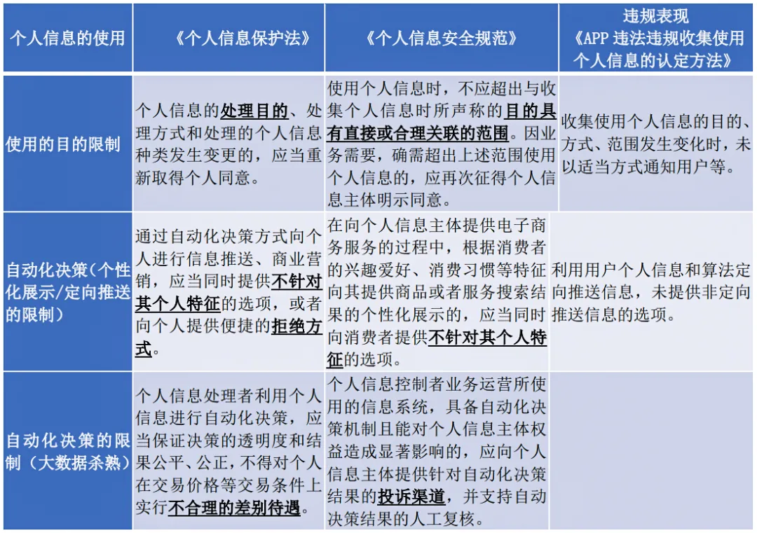 個人信息的使用是指個人信息收集之后,根據收集目的進行的分析、處理。《個人信息保護法》《個人信息安全規范》《特區條例》中對使用的限制歸結為四類:對個人信息的展示限制、目的限制、用戶畫像限制、自動化決策的限制限制。相較而言,《個人信息保護法》和《特區條例》重點提出了自動化決策不得對個人在交易價格等交易條件上實行不合理的差別待遇的規定。