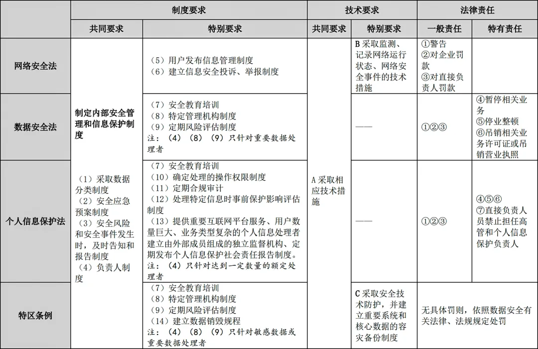 對以上四部法律的制度和技術(shù)要求進行簡化,共性匯總和特性分離后,我們整理出以下簡表:
