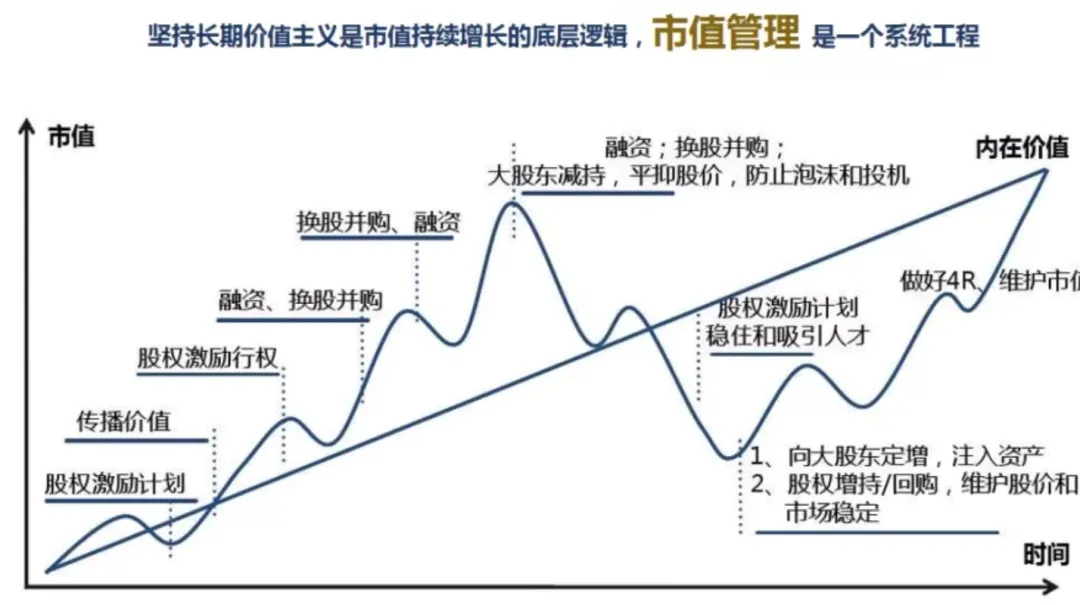 上市公司在價格低于內在價值的時候做一些相應的資本經營動作,比如說增持、回購、股權激勵,因為這個時候買股票是便宜的,因為它低于內在價值;在價格高于內在價值時做一些相應的資本經營動作,比如說增發、換股并購、減持,這樣的話就可以在市值的波動過程當中去提升公司競爭力。例如,在股價較高時增發新股或換股收購資產,上市公司就從資本市場獲得了更低的融資成本或者利用資本市場對企業股權的溢價定價去換取了非上市公司的資產或者股權,有助于增加公司的發展潛力和提升核心競爭力,從而促進公司的可持續增長。