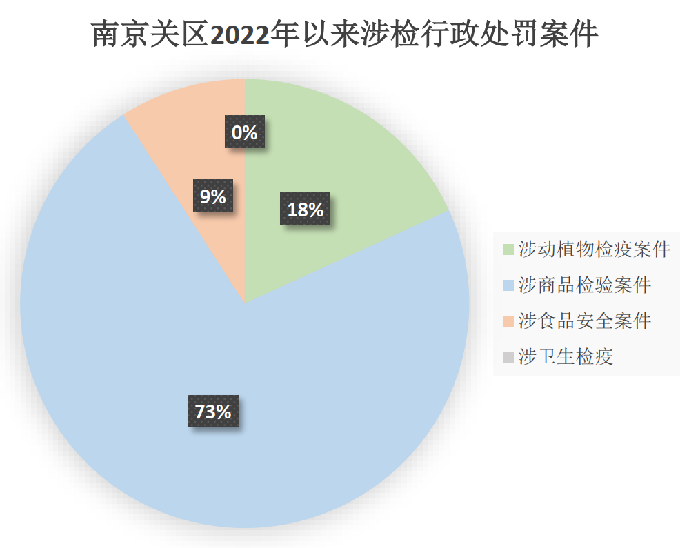 2022年以來[注3],南京海關檢驗檢疫行政處罰案件共檢索到11起,其中數量最多的仍然是涉商品檢驗案件,以未如實申報法檢商品而逃避商檢、擅自出口未報檢法檢商品的案件較為高發,其中危險化學品未依法報檢需引起重視;涉動植物檢疫案件2起,貨物為地板及高背長額蝦,其中出口地板因偽造植物檢疫證書而被處以2萬元罰款;涉食品安全案件1起,最終以經銷商符合免予處罰的情形而不予行政處罰。從類似案件的處罰結果看,根據處罰決定書載明的事實情況,南京關區的處罰金額相對較低。