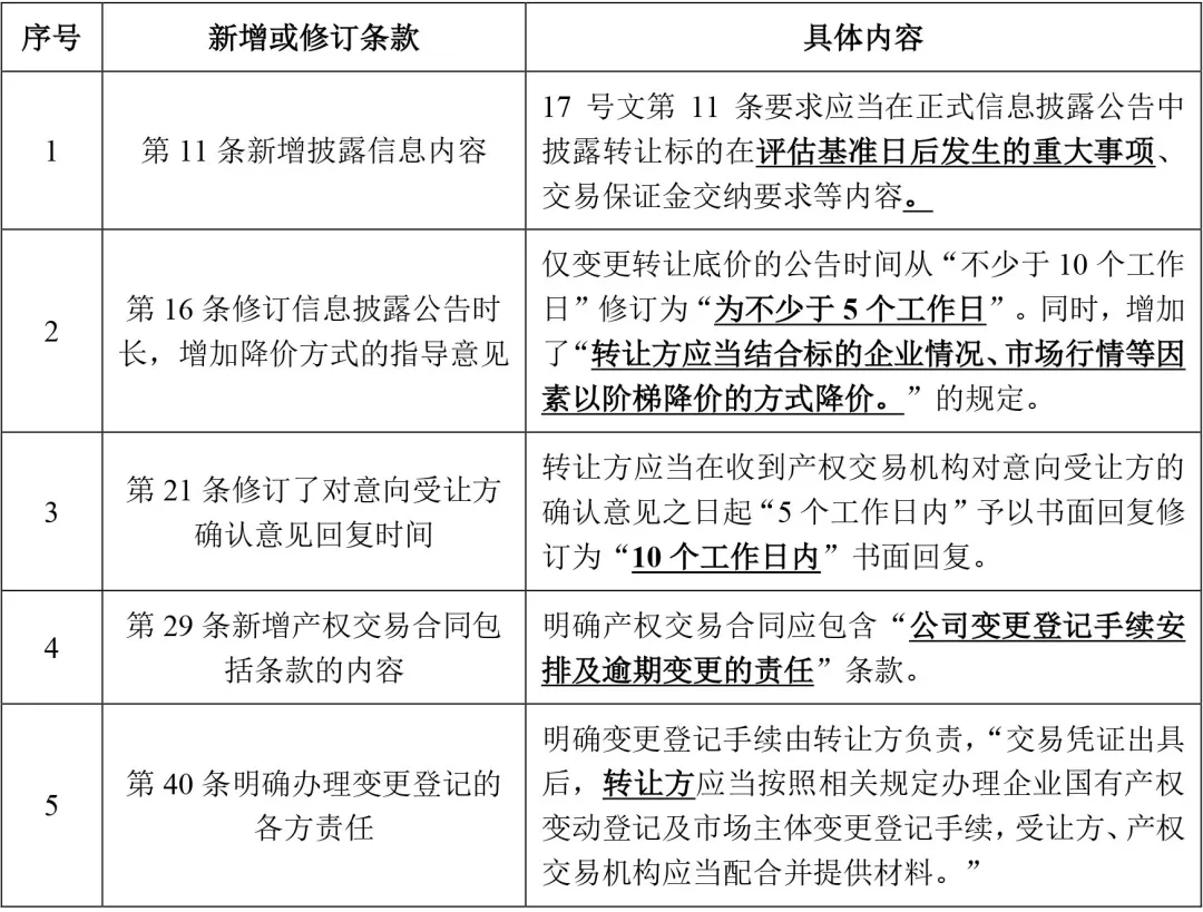 在相關(guān)國(guó)有資產(chǎn)交易事項(xiàng)中,17號(hào)文對(duì)產(chǎn)權(quán)轉(zhuǎn)讓及企業(yè)增資相關(guān)協(xié)議的條款內(nèi)容進(jìn)行了調(diào)整、增加: